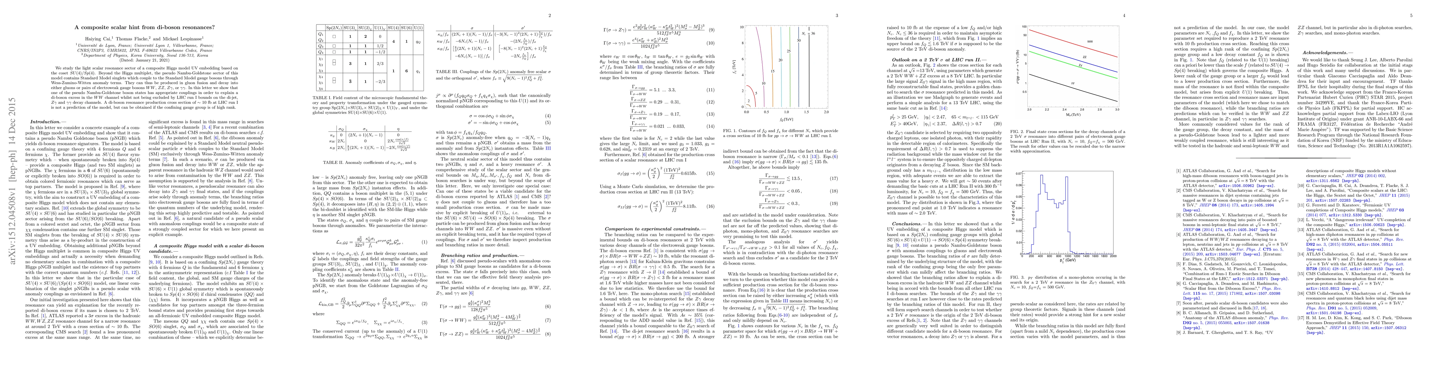 This paper explores the light scalar resonance sector of a composite Higgs model based on $SU(4)/Sp(4)$, identifying a pseudo Nambu-Goldstone boson with suitable couplings to explain a di-boson excess in the $WW$ channel without contradicting LHC run I bounds on other decay channels. The model does not predict a specific di-boson resonance cross section but allows for it under certain conditions.