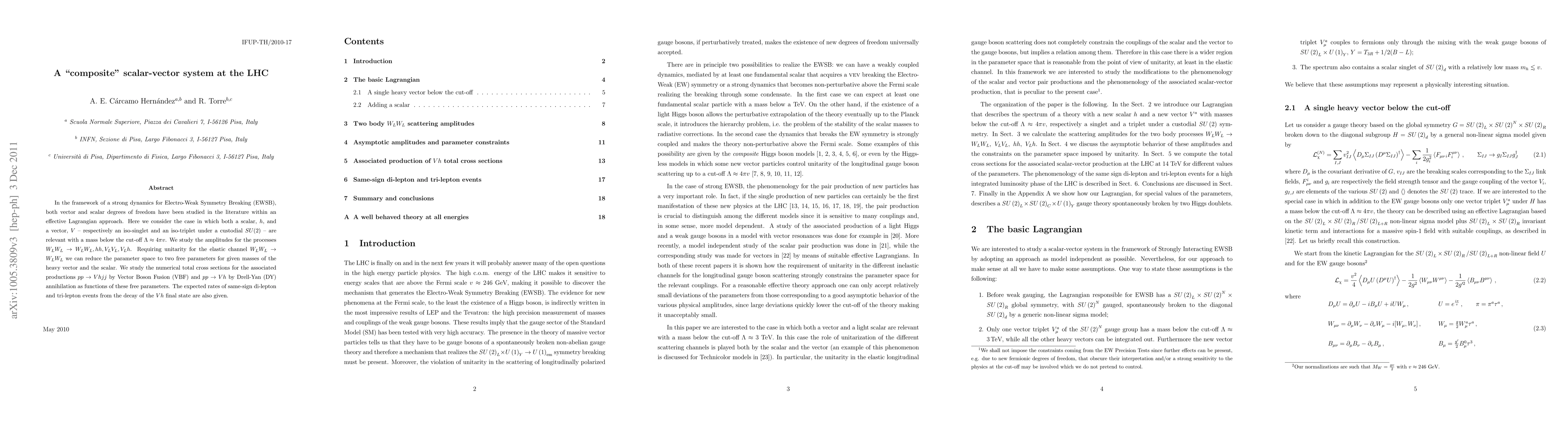In the framework of a strong dynamics for Electro-Weak Symmetry Breaking (EWSB), both vector and scalar degrees of freedom have been studied in the literature within an effective Lagrangian approach. Here we consider the case in which both a scalar, $h$, and a vector, $V$ - respectively an iso-singlet and an iso-triplet under a custodial SU(2) - are relevant with a mass below the cut-off $\Lambda \approx 4\pi v$. We study the amplitudes for the processes $W_L W_L \to W_L W_L, hh, V_{L}V_{L}, V_{L}h$. Requiring unitarity for the elastic channel $W_L W_L \to W_L W_L$ we can reduce the parameter space to two free parameters for given masses of the heavy vector and the scalar. We study the numerical total cross sections for the associated productions $pp\to Vhjj$ by Vector Boson Fusion (VBF) and $pp\to Vh$ by Drell-Yan (DY) annihilation as functions of these free parameters. The expected rates of same-sign di-lepton and tri-lepton events from the decay of the $Vh$ final state are also given.