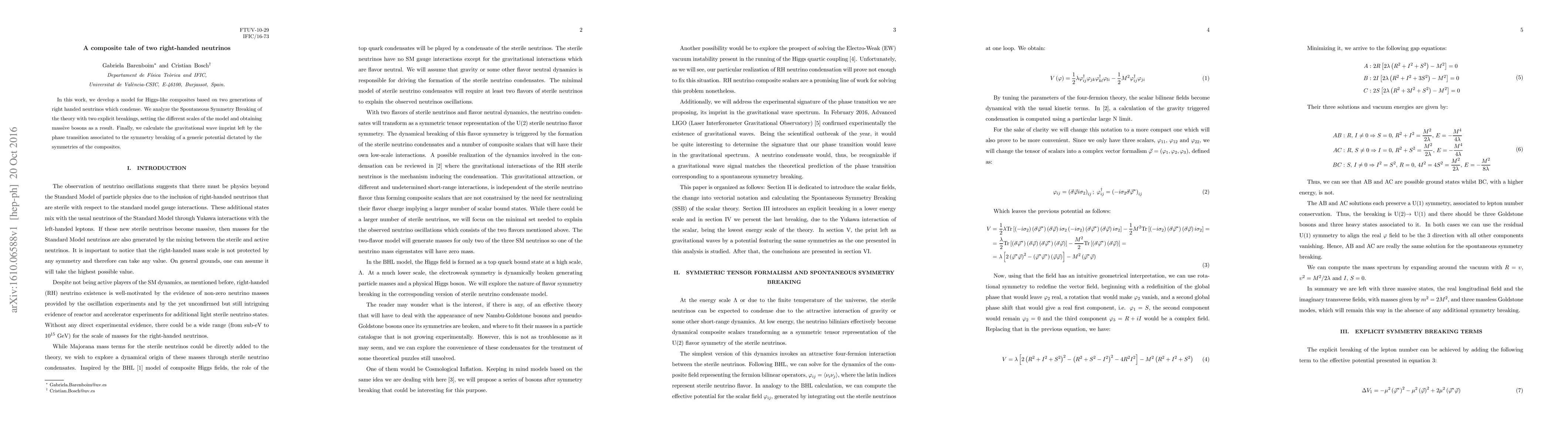 In this work, we develop a model for Higgs-like composites based on two generations of right handed neutrinos which condense. We analyze the Spontaneous Symmetry Breaking of the theory with two explicit breakings, setting the different scales of the model and obtaining massive bosons as a result. Finally, we calculate the gravitational wave imprint left by the phase transition associated to the symmetry breaking of a generic potential dictated by the symmetries of the composites.
