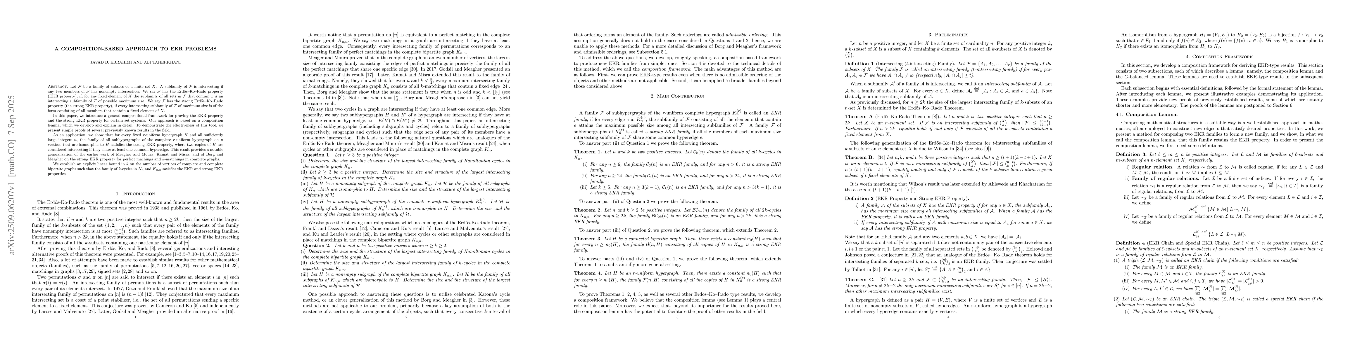 Let ${\mathcal F}$ be a family of subsets of a finite set $X$. A subfamily of ${\mathcal F}$ is intersecting if any two members of ${\mathcal F}$ has nonempty intersection. We say ${\mathcal F}$ has the EKR property, if, for any fixed element of $X$ the subfamily of all sets in $\mathcal{F}$ that contain $x$ is an intersecting subfamily of $\mathcal{F}$ of possible maximum size. We say ${\mathcal F}$ has the strong EKR property (the strong EKR property), if every intersecting subfamily of $\mathcal{F}$ of maximum size is of the form consisting of all members that contain a fixed element of $X$. In this paper, we introduce a general compositional framework for proving the EKR property and the strong EKR property for certain set systems. Our approach is based on a composition lemma, which we develop and explain in detail. To demonstrate the effectiveness of this tool, we present simple proofs of several previously known results in the field. As an application, we show that for every fixed $r$-uniform hypergraph $H$ and all sufficiently large integers $n$, the family of all subhypergraphs of the complete $r$-uniform hypergraph on $n$ vertices that are isomorphic to $H$ satisfies the strong EKR property, where two copies of $H$ are considered intersecting if they share at least one common hyperedge. This result provides a notable generalization of the earlier work of Meagher and Moura, Kamat and Misra, and of Borg and Meagher on the strong EKR property for perfect machings and $k$-matchings in complete graphs. We establish an explicit linear bound in $k$ on the number of vertices of complete and complete bipartite graphs such that the family of $k$-cycles in $K_n$ and $K_{n,n}$ satisfies the EKR and strong EKR properties.
