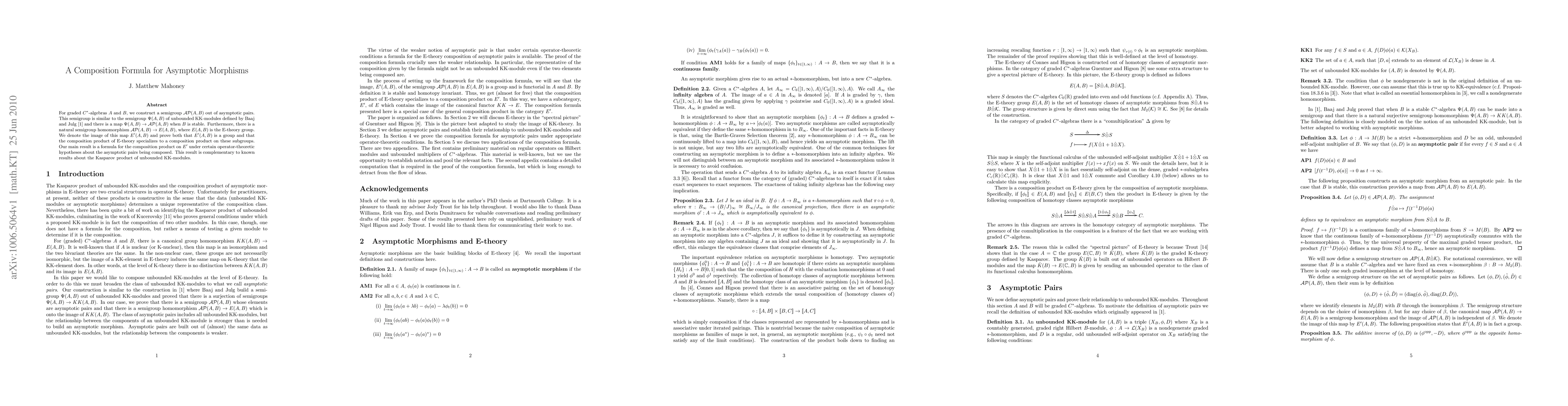 For graded $C^*$-algebras $A$ and $B$, we construct a semigroup ${\cal AP}(A,B)$ out of asymptotic pairs. This semigroup is similar to the semigroup $\Psi(A,B)$ of unbounded KK-modules defined by Baaj and Julg and there is a map $\Psi(A,B) \to {\cal AP}(A,B)$ when $B$ is stable. Furthermore, there is a natural semigroup homomorphism ${\cal AP}(A,B) \to E(A,B)$, where $E(A,B)$ is the E-theory group. We denote the image of this map $E'(A,B)$ and prove both that $E'(A,B)$ is a group and that the composition product of E-theory specializes to a composition product on these subgroups. Our main result is a formula for the composition product on $E'$ under certain operator-theoretic hypotheses about the asymptotic pairs being composed. This result is complementary to known results about the Kasparov product of unbounded KK-modules.