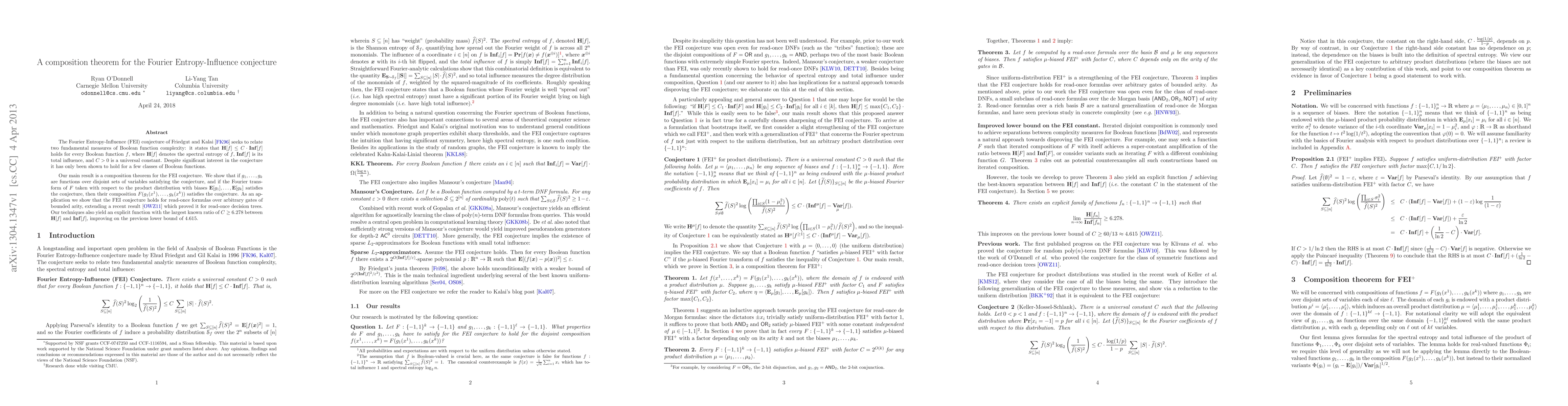 The paper presents a composition theorem for the Fourier Entropy-Influence conjecture, proving that if individual Boolean functions satisfy the conjecture, their composition also does, thus extending its validity to read-once formulas. It also improves the known ratio between spectral entropy and total influence to 6.278.