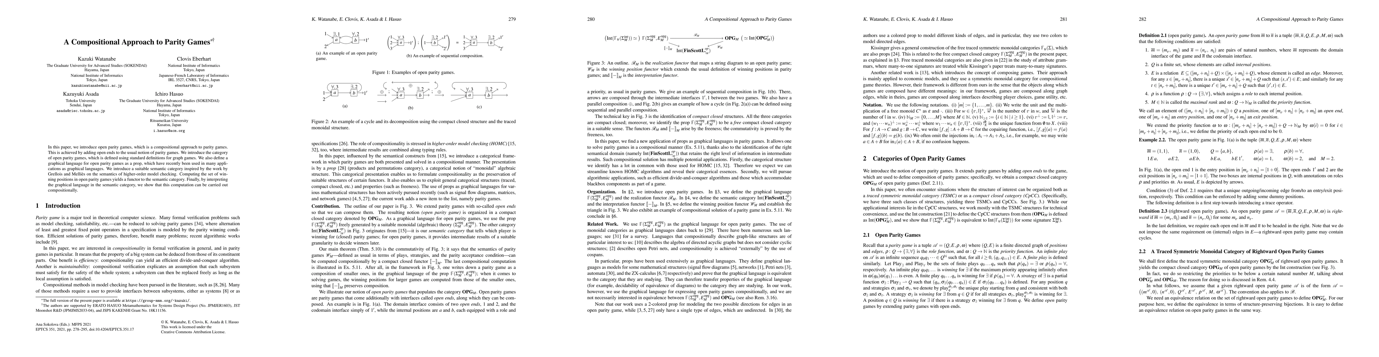 This paper introduces open parity games, a compositional framework for parity games, by extending them with open ends. It defines a category for these games and a graphical language for them, enabling a compositional computation of winning positions through a semantic category inspired by higher-order model checking.