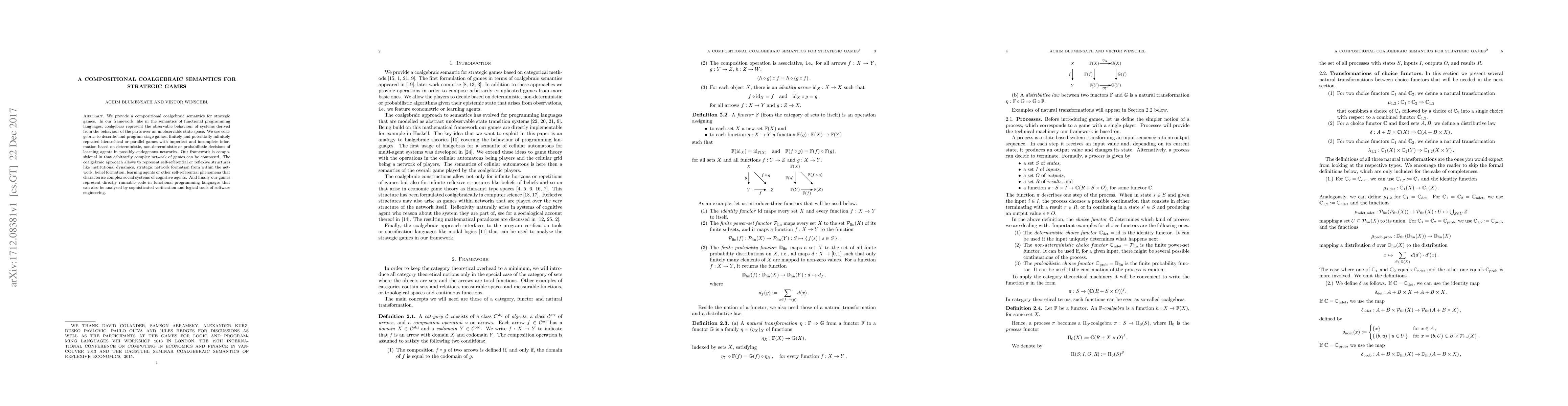 We provide a compositional coalgebraic semantics for strategic games. In our framework, like in the semantics of functional programming languages, coalgebras represent the observable behaviour of systems derived from the behaviour of the parts over an unobservable state space. We use coalgebras to describe and program stage games, finitely and potentially infinitely repeated hierarchical or parallel games with imperfect and incomplete information based on deterministic, non-deterministic or probabilistic decisions of learning agents in possibly endogenous networks. Our framework is compositional in that arbitrarily complex network of games can be composed. The coalgebraic approach allows to represent self-referential or reflexive structures like institutional dynamics, strategic network formation from within the network, belief formation, learning agents or other self-referential phenomena that characterise complex social systems of cognitive agents. And finally our games represent directly runnable code in functional programming languages that can also be analysed by sophisticated verification and logical tools of software engineering.