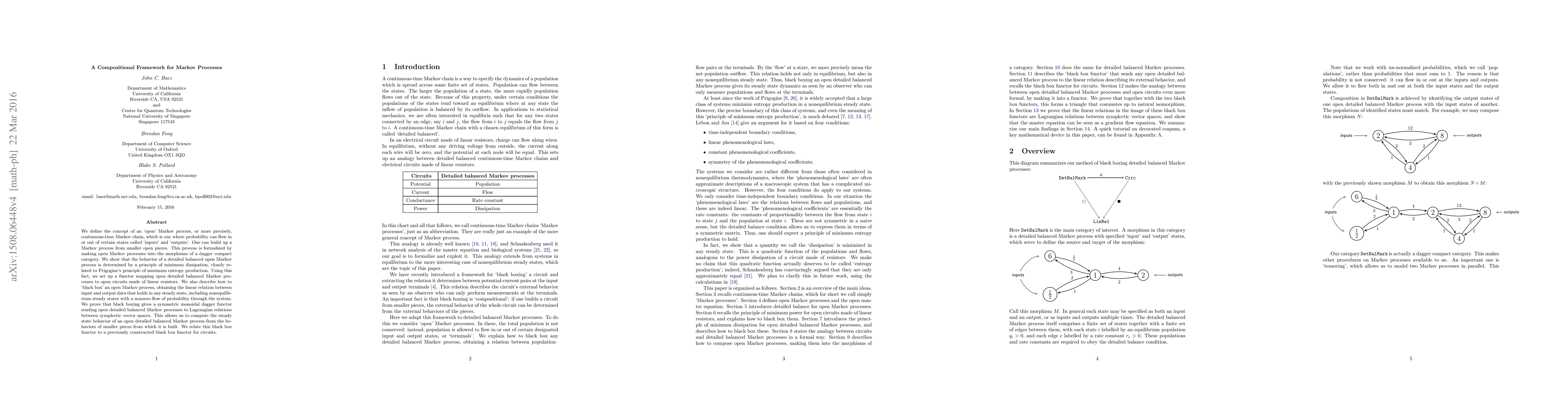 We define the concept of an "open" Markov process, or more precisely, continuous-time Markov chain, which is one where probability can flow in or out of certain states called "inputs" and "outputs". One can build up a Markov process from smaller open pieces. This process is formalized by making open Markov processes into the morphisms of a dagger compact category. We show that the behavior of a detailed balanced open Markov process is determined by a principle of minimum dissipation, closely related to Prigogine's principle of minimum entropy production. Using this fact, we set up a functor mapping open detailed balanced Markov processes to open circuits made of linear resistors. We also describe how to "black box" an open Markov process, obtaining the linear relation between input and output data that holds in any steady state, including nonequilibrium steady states with a nonzero flow of probability through the system. We prove that black boxing gives a symmetric monoidal dagger functor sending open detailed balanced Markov processes to Lagrangian relations between symplectic vector spaces. This allows us to compute the steady state behavior of an open detailed balanced Markov process from the behaviors of smaller pieces from which it is built. We relate this black box functor to a previously constructed black box functor for circuits.