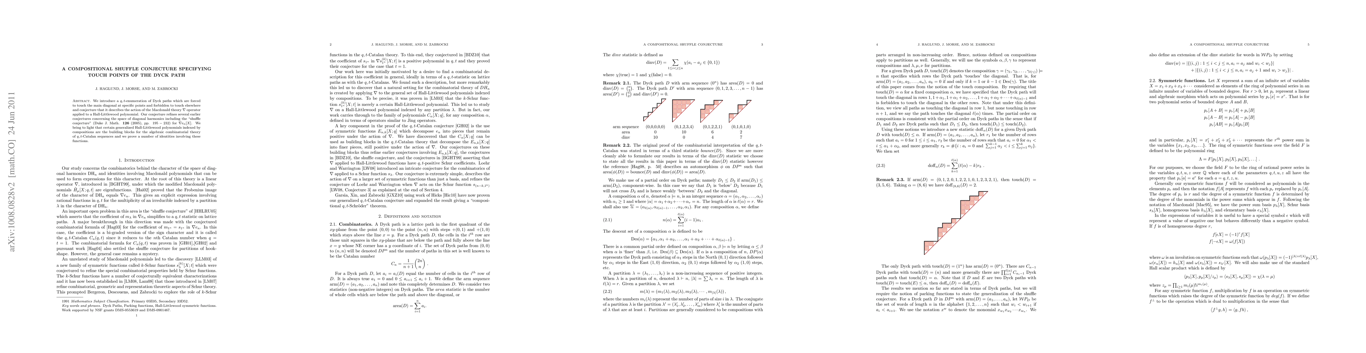 We introduce a $q,t$-enumeration of Dyck paths which are forced to touch the main diagonal at specific points and forbidden to touch elsewhere and conjecture that it describes the action of the Macdonald theory $\nabla$ operator applied to a Hall-Littlewood polynomial. Our conjecture refines several earlier conjectures concerning the space of diagonal harmonics including the "shuffle conjecture" (Duke J. Math. $\mathbf {126}$ (2005), pp. 195-232) for $\nabla e_n[X]$. We bring to light that certain generalized Hall-Littlewood polynomials indexed by compositions are the building blocks for the algebraic combinatorial theory of $q,t$-Catalan sequences and we prove a number of identities involving these functions.