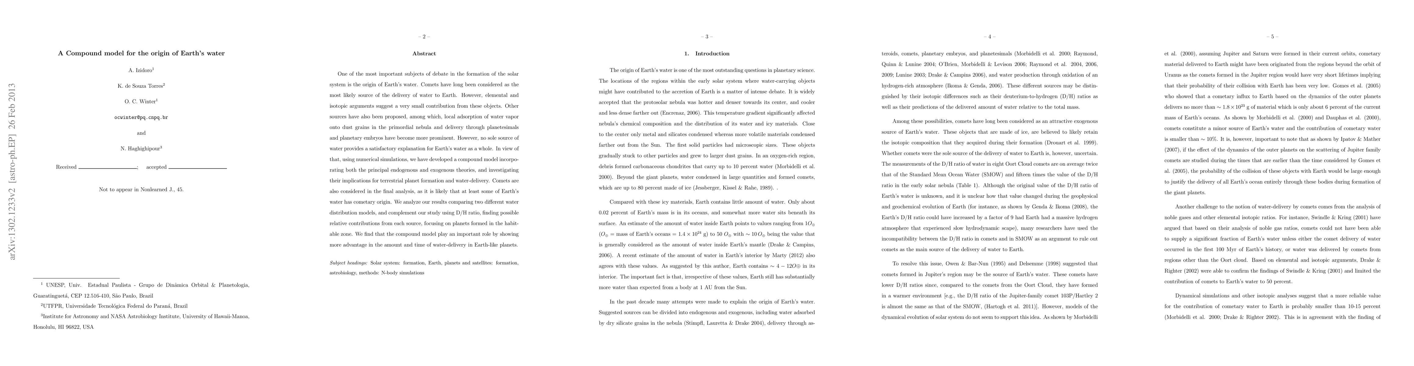 One of the most important subjects of debate in the formation of the solar system is the origin of Earth's water. Comets have long been considered as the most likely source of the delivery of water to Earth. However, elemental and isotopic arguments suggest a very small contribution from these objects. Other sources have also been proposed, among which, local adsorption of water vapor onto dust grains in the primordial nebula and delivery through planetesimals and planetary embryos have become more prominent. However, no sole source of water provides a satisfactory explanation for Earth's water as a whole. In view of that, using numerical simulations, we have developed a compound model incorporating both the principal endogenous and exogenous theories, and investigating their implications for terrestrial planet formation and water-delivery. Comets are also considered in the final analysis, as it is likely that at least some of Earth's water has cometary origin. We analyze our results comparing two different water distribution models, and complement our study using D/H ratio, finding possible relative contributions from each source, focusing on planets formed in the habitable zone. We find that the compound model play an important role by showing more advantage in the amount and time of water-delivery in Earth-like planets.