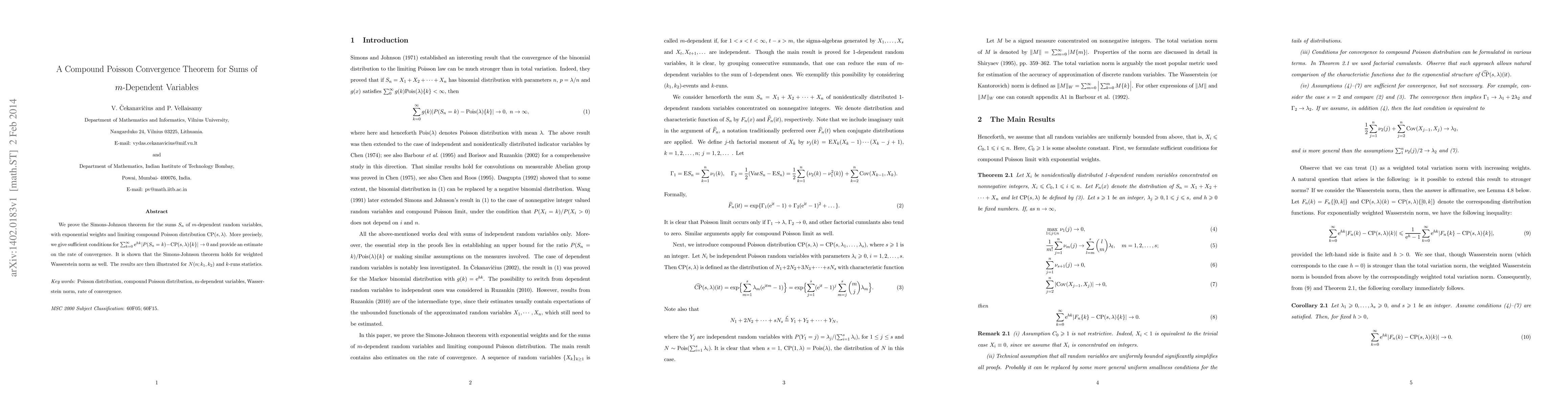 This paper proves the Simons-Johnson theorem for sums of $m$-dependent random variables with exponential weights, establishing sufficient conditions for convergence to a limiting compound Poisson distribution $\CP(s,\lambda)$ and providing an estimate on the rate of convergence. The results are also shown to hold for weighted Wasserstein norm.