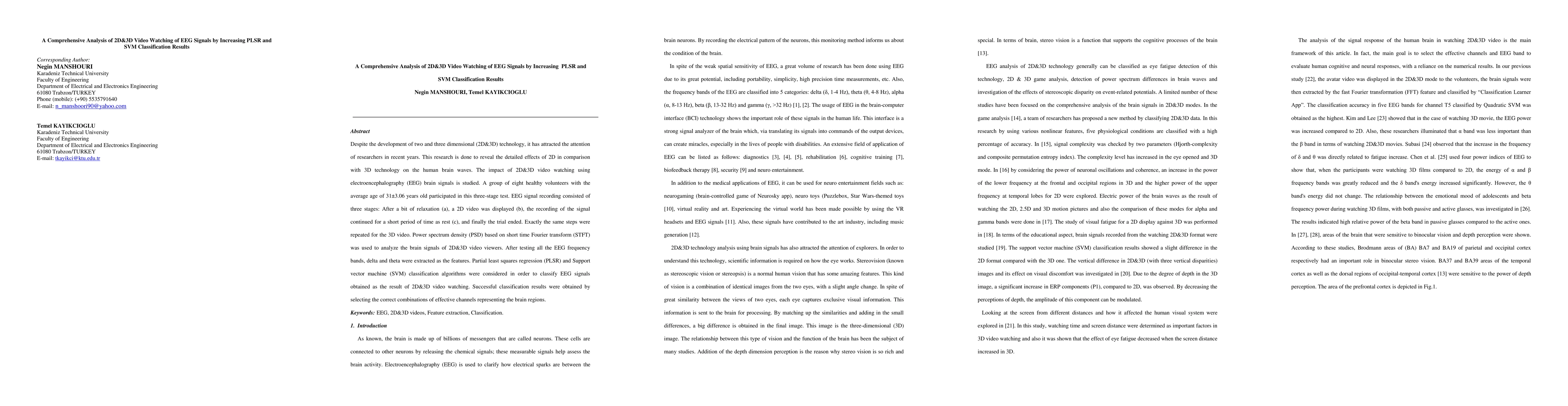 Despite the development of two and three dimensional (2D&3D) technology, it has attracted the attention of researchers in recent years. This research is done to reveal the detailed effects of 2D in comparison with 3D technology on the human brain waves. The impact of 2D&3D video watching using electroencephalography (EEG) brain signals is studied. A group of eight healthy volunteers with the average age of 31+-3.06 years old participated in this three-stage test. EEG signal recording consisted of three stages: After a bit of relaxation (a), a 2D video was displayed (b), the recording of the signal continued for a short period of time as rest (c), and finally the trial ended. Exactly the same steps were repeated for the 3D video. Power spectrum density (PSD) based on short time Fourier transform (STFT) was used to analyze the brain signals of 2D&3D video viewers. After testing all the EEG frequency bands, delta and theta were extracted as the features. Partial least squares regression (PLSR) and Support vector machine (SVM) classification algorithms were considered in order to classify EEG signals obtained as the result of 2D&3D video watching. Successful classification results were obtained by selecting the correct combinations of effective channels representing the brain regions.