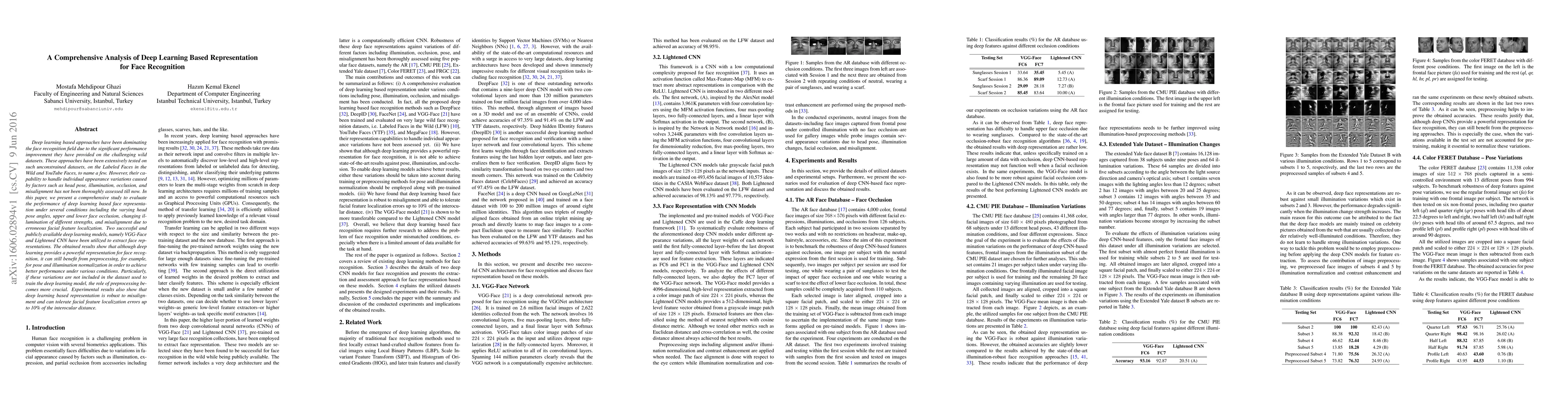 This paper evaluates the performance of deep learning models, VGG-Face and Lightened CNN, for face recognition under various challenging conditions including head pose, illumination, occlusion, and misalignment. The study finds that while deep learning provides strong face representations, preprocessing for normalization can further enhance performance, especially when training data does not cover these variations.