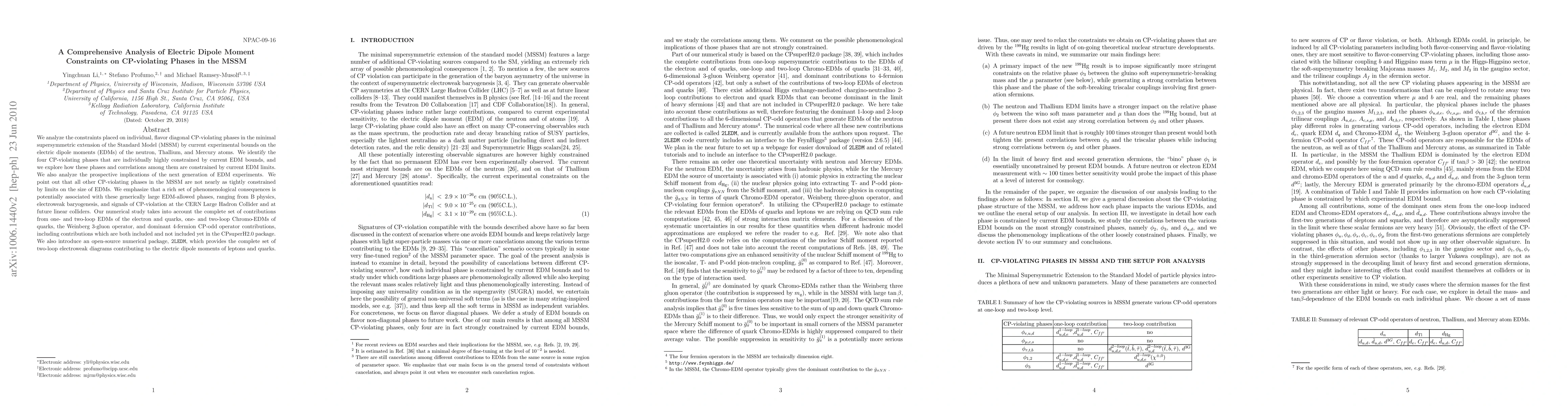 This research paper analyzes how current experimental limits on electric dipole moments (EDMs) constrain individual CP-violating phases in the MSSM. It identifies four highly constrained phases and discusses their implications for B physics, electroweak baryogenesis, and CP-violation signals at colliders. It introduces a new numerical package, 2LEDM, to compute two-loop electroweak EDM contributions.