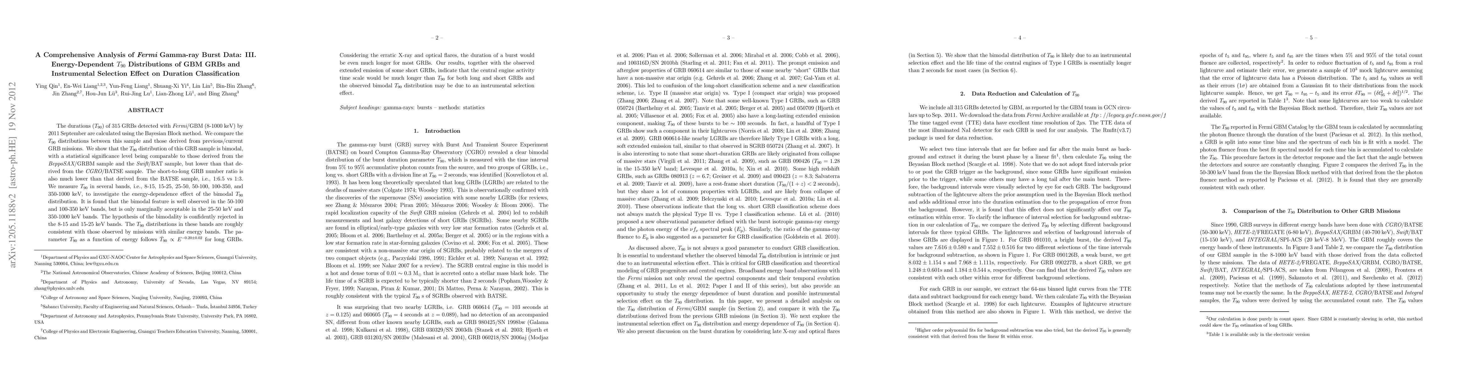 The durations (T90) of 315 GRBs detected with Fermi/GBM (8-1000 keV) by 2011 September are calculated using the Bayesian Block method. We compare the T90 distributions between this sample and those derived from previous/current GRB missions. We show that the T90 distribution of this GRB sample is bimodal, with a statistical significance level being comparable to those derived from the BeppoSAX/GRBM sample and the Swift/BAT sample, but lower than that derived from the CGRO/BATSE sample. The short-to-long GRB number ratio is also much lower than that derived from the BATSE sample, i.e., 1:6.5 vs 1:3. We measure T90 in several bands, i.e., 8-15, 15-25, 25-50, 50-100, 100-350, and 350-1000 keV, to investigate the energy-dependence effect of the bimodal T90 distribution. It is found that the bimodal feature is well observed in the 50-100 and 100-350 keV bands, but is only marginally acceptable in the 25-50 keV and 350-1000 keV bands. The hypothesis of the bimodality is confidently rejected in the 8-15 and 15-25 keV bands. The T90 distributions in these bands are roughly consistent with those observed by missions with similar energy bands. The parameter T90 as a function of energy follows \bar T90 \propto E^{-0.20\pm 0.02} for long GRBs. Considering the erratic X-ray and optical flares, the duration of a burst would be even much longer for most GRBs. Our results, together with the observed extended emission of some short GRBs, indicate that the central engine activity time scale would be much longer than T90} for both long and short GRBs and the observed bimodal T90 distribution may be due to an instrumental selection effect.