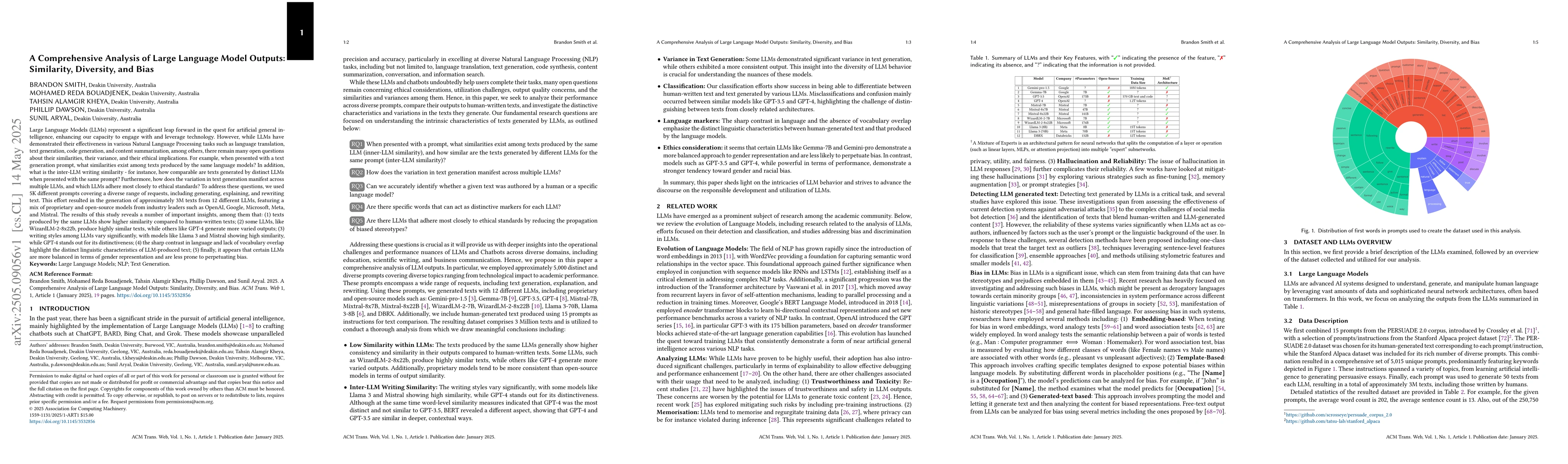 Large language models produce similar outputs from the same model but less so than human-written texts, with some models showing greater diversity and reduced bias; this analysis guides future development and ethical evaluation of LLMs.