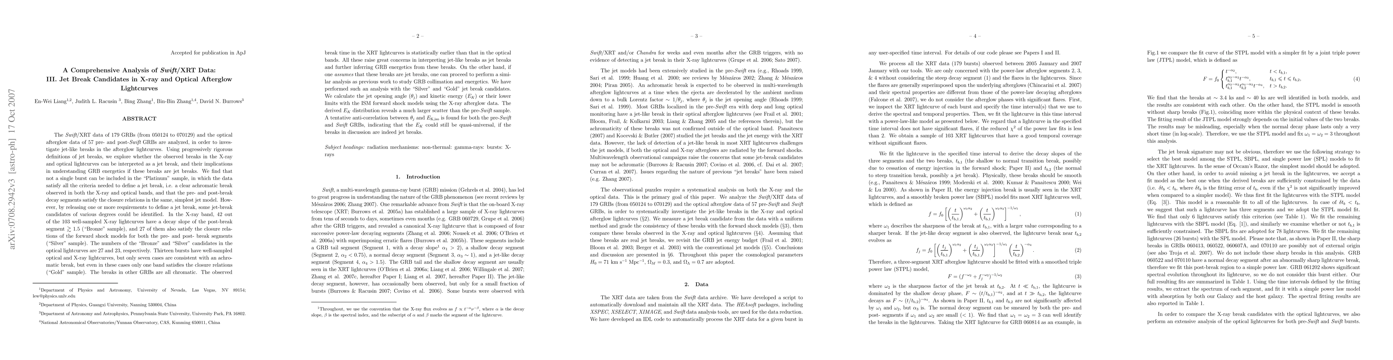 This paper analyzes Swift/XRT data from 179 GRBs and optical afterglow data from 57 GRBs to investigate jet breaks in X-ray and optical lightcurves. Despite relaxing criteria, no burst fully meets the "Platinum" jet break definition, raising concerns about interpreting these breaks as true jet breaks. The study identifies "Bronze" and "Silver" candidates in both X-ray and optical bands, but only a few meet stringent achromatic break criteria ("Gold" sample).