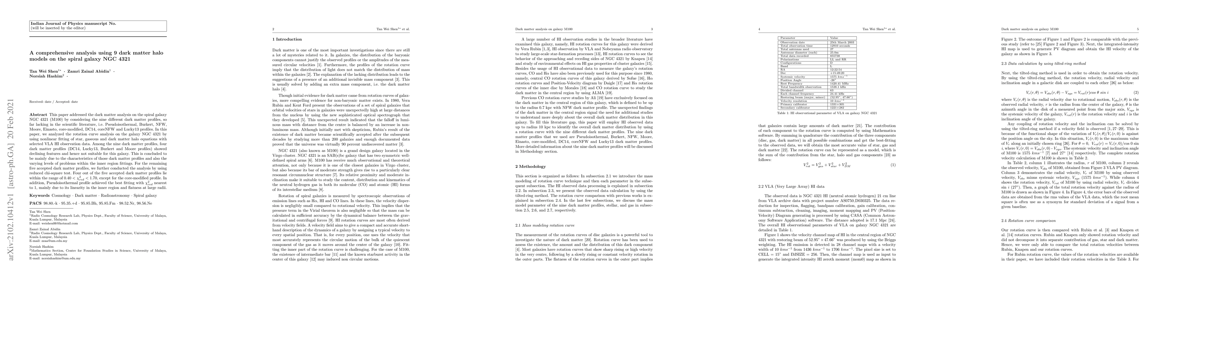 A study analyzed 9 dark matter halo models in galaxy NGC 4321, finding that 4 models were unsuitable due to declining features or inner region problems, while the remaining 5 models showed promising results with reduced chi-square values below 1.70.