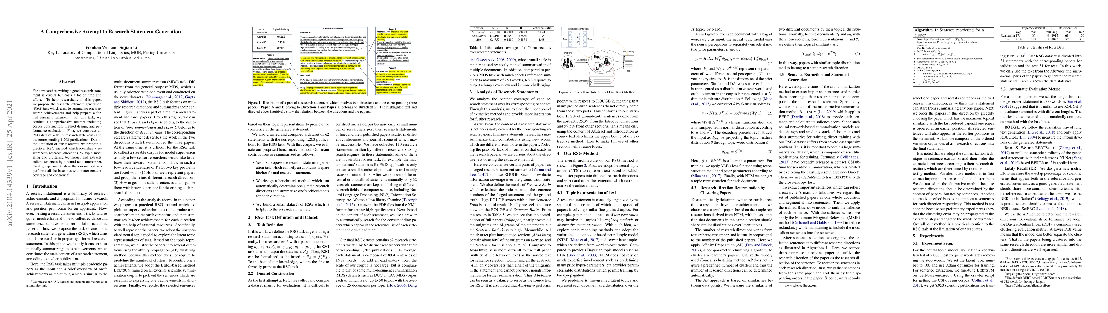 For a researcher, writing a good research statement is crucial but costs a lot of time and effort. To help researchers, in this paper, we propose the research statement generation (RSG) task which aims to summarize one's research achievements and help prepare a formal research statement. For this task, we conduct a comprehensive attempt including corpus construction, method design, and performance evaluation. First, we construct an RSG dataset with 62 research statements and the corresponding 1,203 publications. Due to the limitation of our resources, we propose a practical RSG method which identifies a researcher's research directions by topic modeling and clustering techniques and extracts salient sentences by a neural text summarizer. Finally, experiments show that our method outperforms all the baselines with better content coverage and coherence.