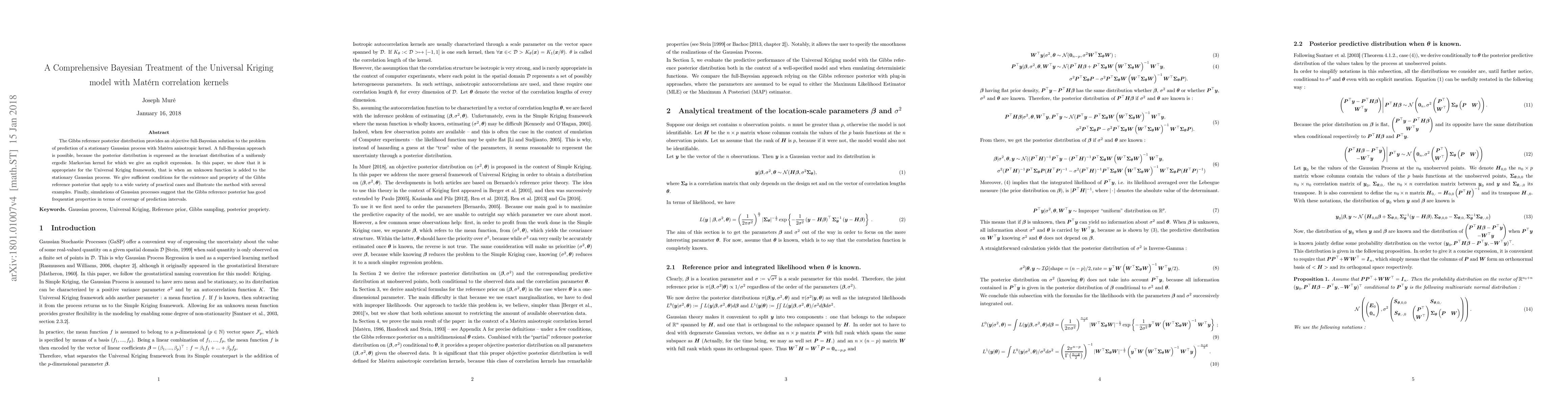 This paper presents a full-Bayesian treatment of the Universal Kriging model using Matérn correlation kernels, showing that the Gibbs reference posterior provides an objective solution. It demonstrates the method's applicability and provides sufficient conditions for its existence, supported by simulations indicating good frequentist properties.
