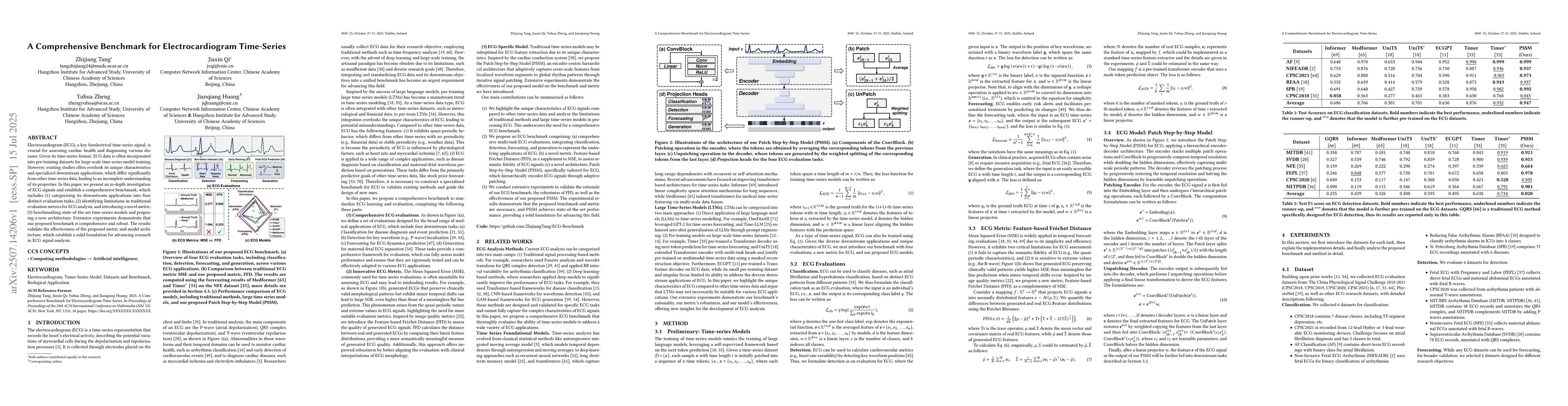 Electrocardiogram~(ECG), a key bioelectrical time-series signal, is crucial for assessing cardiac health and diagnosing various diseases. Given its time-series format, ECG data is often incorporated into pre-training datasets for large-scale time-series model training. However, existing studies often overlook its unique characteristics and specialized downstream applications, which differ significantly from other time-series data, leading to an incomplete understanding of its properties. In this paper, we present an in-depth investigation of ECG signals and establish a comprehensive benchmark, which includes (1) categorizing its downstream applications into four distinct evaluation tasks, (2) identifying limitations in traditional evaluation metrics for ECG analysis, and introducing a novel metric; (3) benchmarking state-of-the-art time-series models and proposing a new architecture. Extensive experiments demonstrate that our proposed benchmark is comprehensive and robust. The results validate the effectiveness of the proposed metric and model architecture, which establish a solid foundation for advancing research in ECG signal analysis.