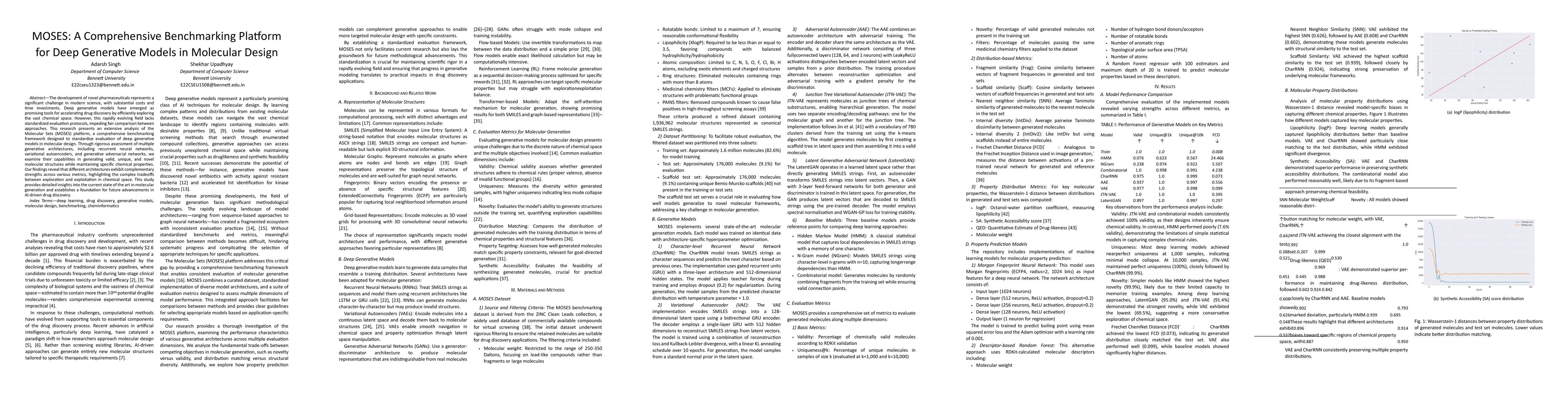 The development of novel pharmaceuticals represents a significant challenge in modern science, with substantial costs and time investments. Deep generative models have emerged as promising tools for accelerating drug discovery by efficiently exploring the vast chemical space. However, this rapidly evolving field lacks standardized evaluation protocols, impeding fair comparison between approaches. This research presents an extensive analysis of the Molecular Sets (MOSES) platform, a comprehensive benchmarking framework designed to standardize evaluation of deep generative models in molecular design. Through rigorous assessment of multiple generative architectures, including recurrent neural networks, variational autoencoders, and generative adversarial networks, we examine their capabilities in generating valid, unique, and novel molecular structures while maintaining specific chemical properties. Our findings reveal that different architectures exhibit complementary strengths across various metrics, highlighting the complex trade-offs between exploration and exploitation in chemical space. This study provides detailed insights into the current state of the art in molecular generation and establishes a foundation for future advancements in AI-driven drug discovery.
