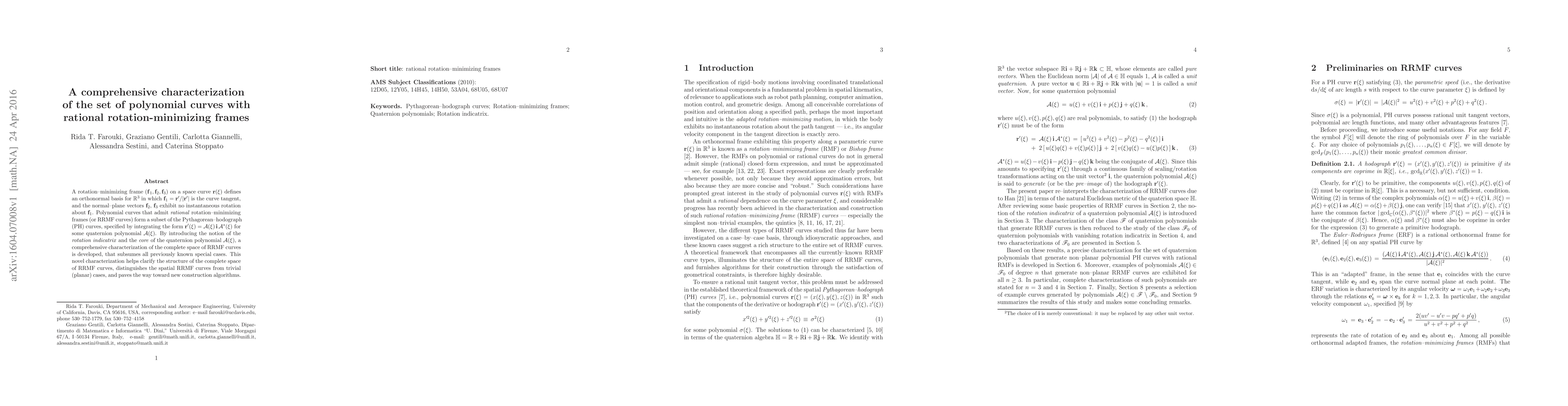 A rotation-minimizing frame $({\bf f}_1,{\bf f}_2,{\bf f}_3)$ on a space curve ${\bf r}(\xi)$ defines an orthonormal basis for $\mathbb{R}^3$ in which ${\bf f}_1={\bf r}'/|{\bf r}'|$ is the curve tangent, and the normal-plane vectors ${\bf f}_2$, ${\bf f}_3$ exhibit no instantaneous rotation about ${\bf f}_1$. Polynomial curves that admit rational rotation-minimizing frames (or RRMF curves) form a subset of the Pythagorean-hodograph (PH) curves, specified by integrating the form ${\bf r}'(\xi)={\cal A}(\xi)\,{\bf i}\,{\cal A}^*(\xi)$ for some quaternion polynomial ${\cal A}(\xi)$. By introducing the notion of rotation indicatrix and of core of the quaternion polynomial ${\cal A}(\xi)$, a comprehensive characterization of the complete space of RRMF curves is developed, that subsumes all previously known special cases. This novel characterization helps clarify the structure of the complete space of RRMF curves, distinguishes the spatial RRMF curves from trivial (planar) cases, and paves the way toward new construction algorithms.
