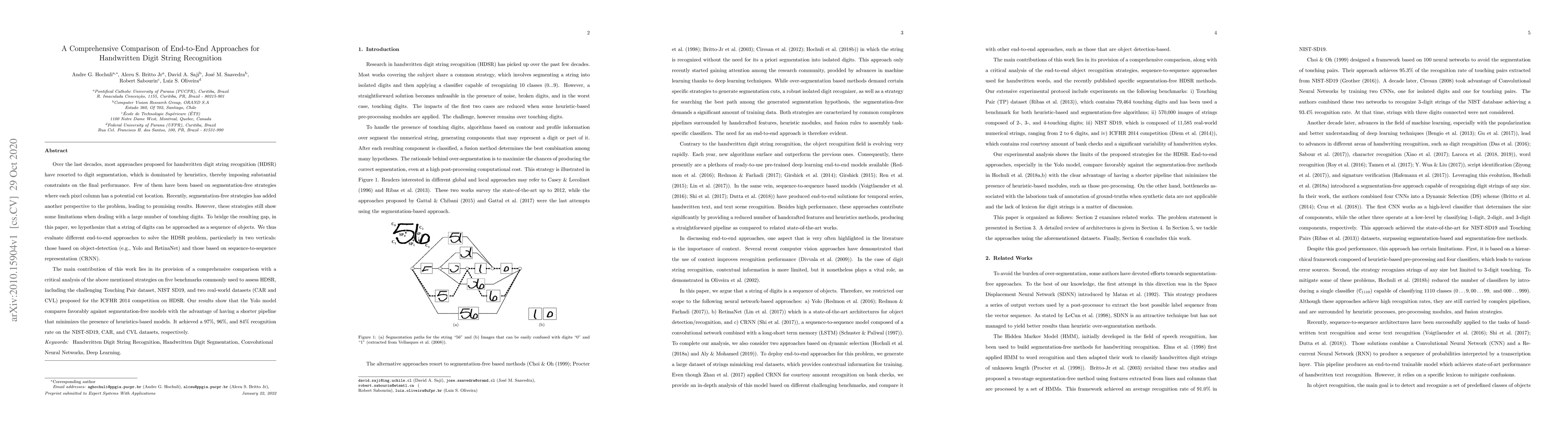 This paper compares end-to-end approaches for handwritten digit string recognition, focusing on object-detection and sequence-to-sequence methods. The Yolo model shows superior performance with a 97%, 96%, and 84% recognition rate on benchmark datasets, demonstrating its effectiveness over segmentation-free strategies.