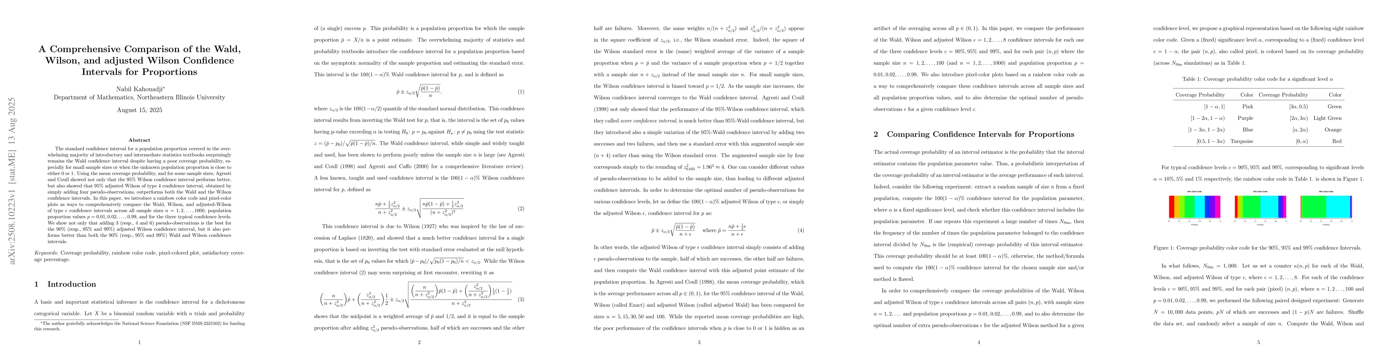 The standard confidence interval for a population proportion covered in the overwhelming majority of introductory and intermediate statistics textbooks surprisingly remains the Wald confidence interval despite having a poor coverage probability, especially for small sample sizes or when the unknown population proportion is close to either 0 or 1. Using the mean coverage probability, and for some sample sizes, Agresti and Coull showed not only that the 95\% Wilson confidence interval performs better, but also showed that 95\% adjusted Wilson of type 4 confidence interval, obtained by simply adding four pseudo-observations, outperforms both the Wald and the Wilson confidence intervals. In this paper, we introduce a rainbow color code and pixel-color plots as ways to comprehensively compare the Wald, Wilson, and adjusted-Wilson of type $\epsilon$ confidence intervals across all sample sizes $n=1, 2, \dots, 1000$, population proportion values $p=0.01, 0.02, \dots, 0.99$, and for the three typical confidence levels. We show not only that adding 3 (resp., 4 and 6) pseudo-observations is the best for the 90\% (resp., 95\% and 99\%) adjusted Wilson confidence interval, but it also performs better than both the 90\% (resp., 95\% and 99\%) Wald and Wilson confidence intervals.