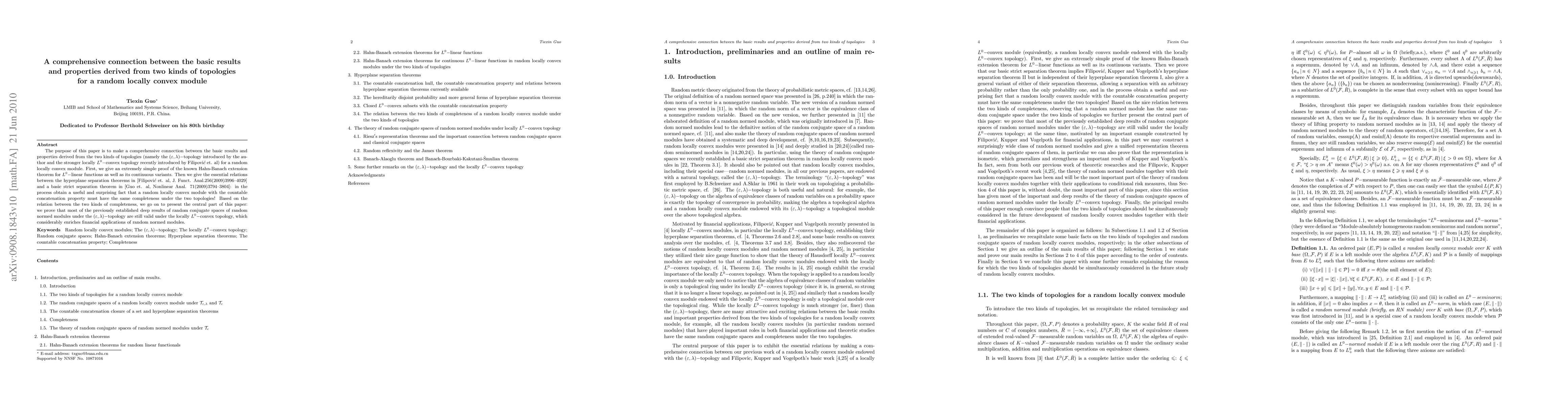 The purpose of this paper is to make a comprehensive connection between the basic results and properties derived from the two kinds of topologies (namely the $(\epsilon,\lambda)-$topology introduced by the author and the stronger locally $L^{0}-$convex topology recently introduced by Filipovi$\acute{c}$ et. al) for a random locally convex module. First, we give an extremely simple proof of the known Hahn-Banach extension theorem of $L^{0}-$linear functions as well as its continuous variants. Then we give the essential relations between the hyperplane separation theorems in [Filipovi$\acute{c}$ et. al, J. Funct. Anal.256(2009)3996--4029] and a basic strict separation theorem in [Guo et. al, Nonlinear Anal. 71(2009)3794--3804]: in the process obtain a useful and surprising fact that a random locally convex module with the countable concatenation property must have the same completeness under the two topologies! Based on the relation between the two kinds of completeness, we go on to present the central part of this paper: we prove that most of the previously established deep results of random conjugate spaces of random normed modules under the $(\epsilon,\lambda)-$topology are still valid under the locally $L^{0}-$convex topology, which considerably enriches financial applications of random normed modules.