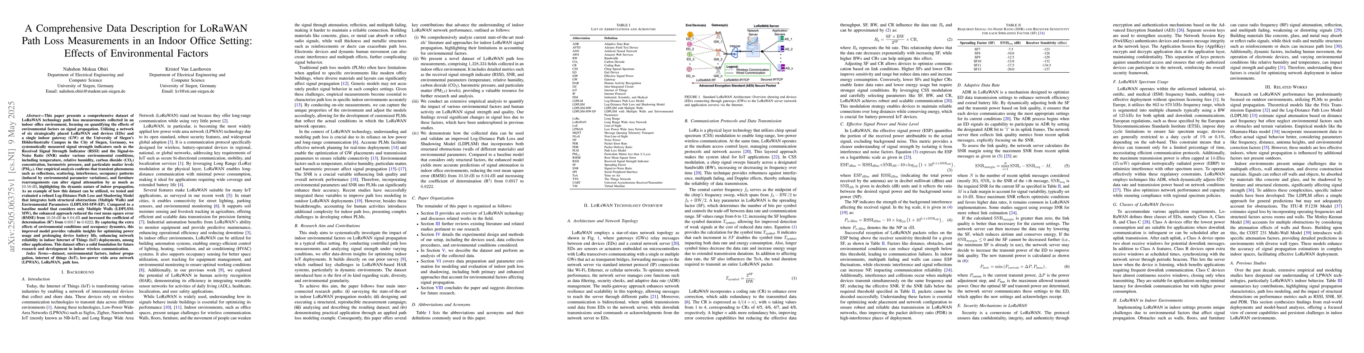 This paper presents a comprehensive dataset of LoRaWAN technology path loss measurements collected in an indoor office environment, focusing on quantifying the effects of environmental factors on signal propagation. Utilizing a network of six strategically placed LoRaWAN end devices (EDs) and a single indoor gateway (GW) at the University of Siegen, City of Siegen, Germany, we systematically measured signal strength indicators such as the Received Signal Strength Indicator (RSSI) and the Signal-to-Noise Ratio (SNR) under various environmental conditions, including temperature, relative humidity, carbon dioxide (CO$_2$) concentration, barometric pressure, and particulate matter levels (PM$_{2.5}$). Our empirical analysis confirms that transient phenomena such as reflections, scattering, interference, occupancy patterns (induced by environmental parameter variations), and furniture rearrangements can alter signal attenuation by as much as 10.58 dB, highlighting the dynamic nature of indoor propagation. As an example of how this dataset can be utilized, we tested and evaluated a refined Log-Distance Path Loss and Shadowing Model that integrates both structural obstructions (Multiple Walls) and Environmental Parameters (LDPLSM-MW-EP). Compared to a baseline model that considers only Multiple Walls (LDPLSM-MW), the enhanced approach reduced the root mean square error (RMSE) from 10.58 dB to 8.04 dB and increased the coefficient of determination (R$^2$) from 0.6917 to 0.8222. By capturing the extra effects of environmental conditions and occupancy dynamics, this improved model provides valuable insights for optimizing power usage and prolonging device battery life, enhancing network reliability in indoor Internet of Things (IoT) deployments, among other applications. This dataset offers a solid foundation for future research and development in indoor wireless communication.