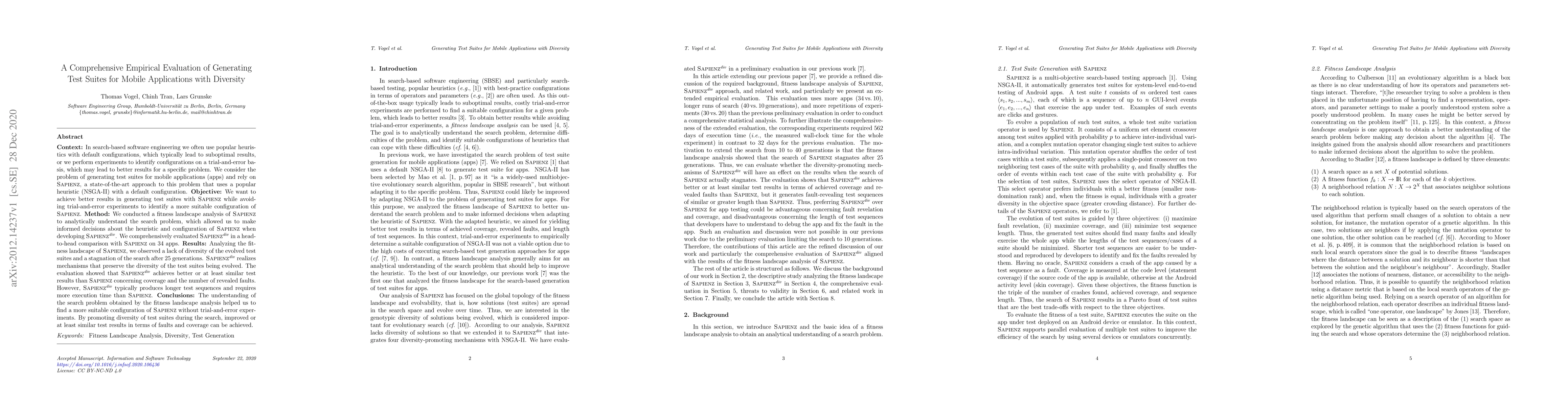 Context: In search-based software engineering we often use popular heuristics with default configurations, which typically lead to suboptimal results, or we perform experiments to identify configurations on a trial-and-error basis, which may lead to better results for a specific problem. We consider the problem of generating test suites for mobile applications (apps) and rely on \Sapienz, a state-of-the-art approach to this problem that uses a popular heuristic (NSGA-II) with a default configuration. Objective: We want to achieve better results in generating test suites with \Sapienz while avoiding trial-and-error experiments to identify a more suitable configuration of \Sapienz. Method: We conducted a fitness landscape analysis of \Sapienz to analytically understand the search problem, which allowed us to make informed decisions about the heuristic and configuration of \Sapienz when developing \SapienzDiv. We comprehensively evaluated \SapienzDiv in a head-to-head comparison with \Sapienz on 34 apps. Results: Analyzing the fitness landscape of \Sapienz, we observed a lack of diversity of the evolved test suites and a stagnation of the search after 25 generations. \SapienzDiv realizes mechanisms that preserve the diversity of the test suites being evolved. The evaluation showed that \SapienzDiv achieves better or at least similar test results than \Sapienz concerning coverage and the number of revealed faults. However, \SapienzDiv typically produces longer test sequences and requires more execution time than \Sapienz. Conclusions: The understanding of the search problem obtained by the fitness landscape analysis helped us to find a more suitable configuration of \Sapienz without trial-and-error experiments. By promoting diversity of test suites during the search, improved or at least similar test results in terms of faults and coverage can be achieved.