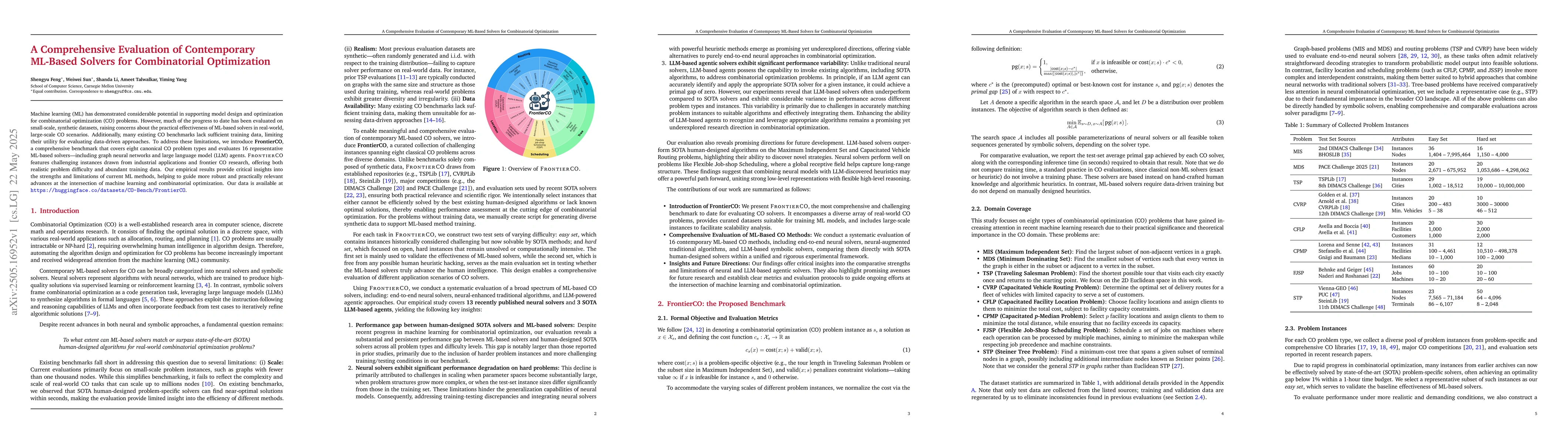 FrontierCO benchmark and empirical evaluation of 16 ML-based solvers for CO problems.