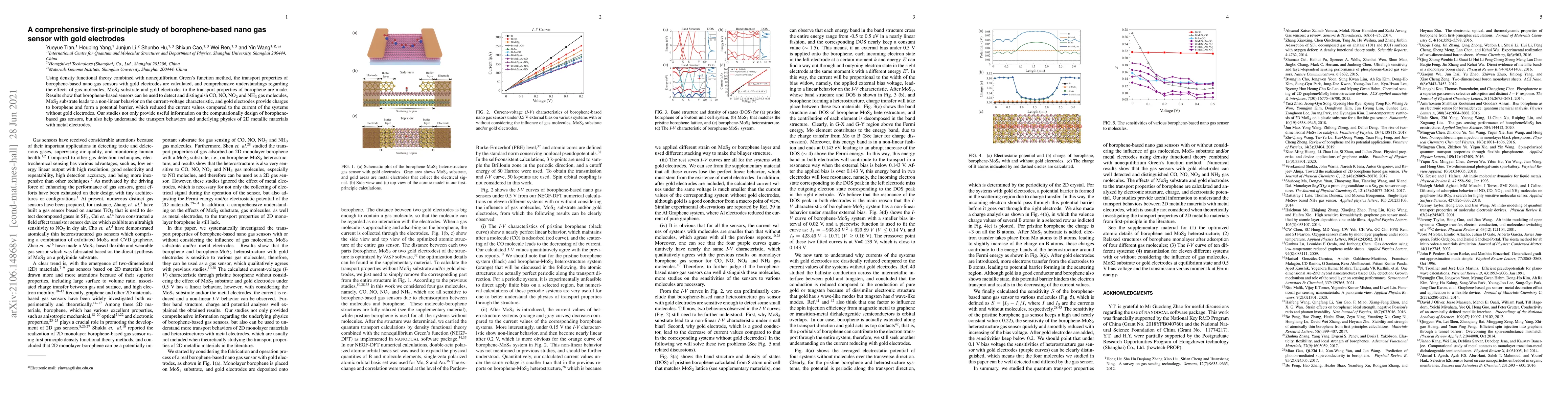Using density functional theory combined with nonequilibrium Green's function method, the transport properties of borophene-based nano gas sensors with gold electrodes are calculated, and comprehensive understandings regarding the effects of gas molecules, MoS$_2$ substrate and gold electrodes to the transport properties of borophene are made. Results show that borophene-based sensors can be used to detect and distinguish CO, NO, NO$_2$ and NH$_3$ gas molecules, MoS$_2$ substrate leads to a non-linear behavior on the current-voltage characteristic, and gold electrodes provide charges to borophene and form a potential barrier, which reduced the current values compared to the current of the systems without gold electrodes. Our studies not only provide useful information on the computationally design of borophene-based gas sensors, but also help understand the transport behaviors and underlying physics of 2D metallic materials with metal electrodes.