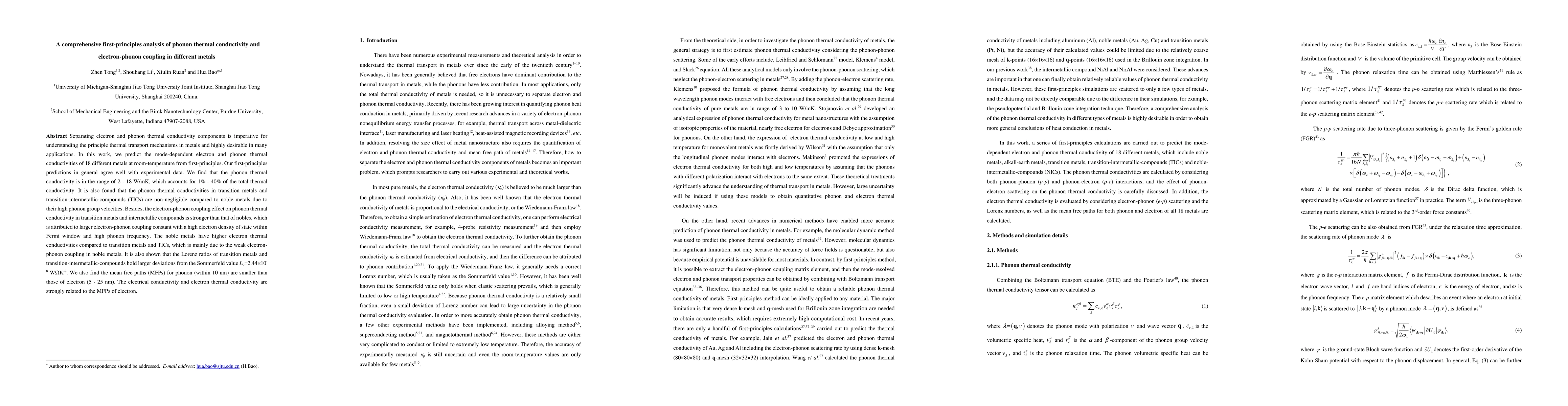 This paper uses first-principles methods to analyze the electron and phonon thermal conductivities of 18 metals at room temperature, finding that phonon conductivities range from 2-18 W/mK and account for 1%-40% of total thermal conductivity. Transition metals and intermetallic compounds show higher phonon conductivities due to higher phonon group velocities and stronger electron-phonon coupling compared to noble metals.