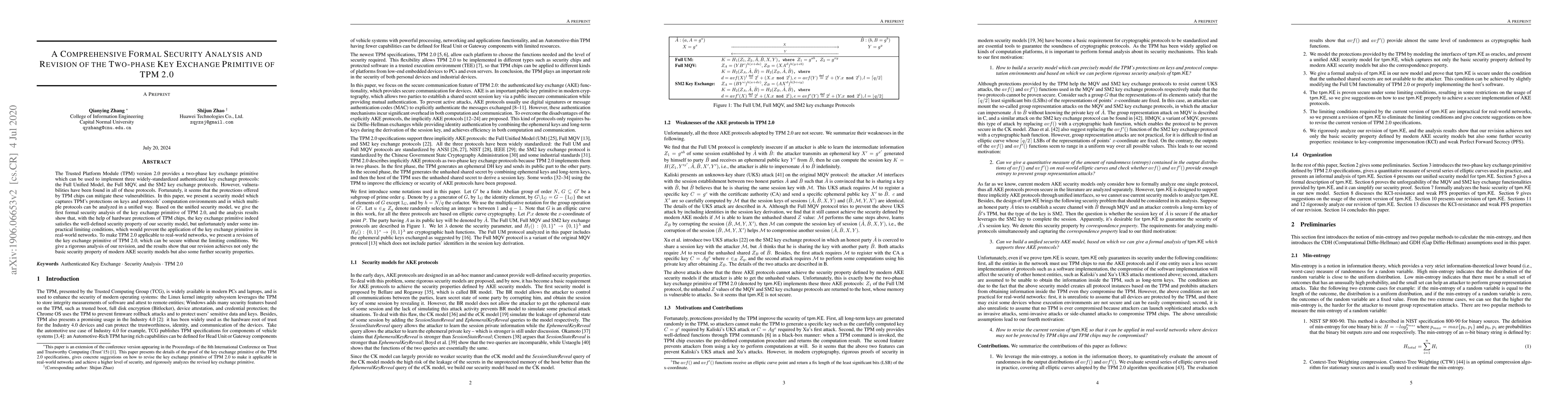 Researchers analyze and revise the two-phase key exchange primitive of TPM 2.0, finding that hardware protections mitigate vulnerabilities but also impose impractical limitations. A revised version achieves secure key exchange without these limitations.