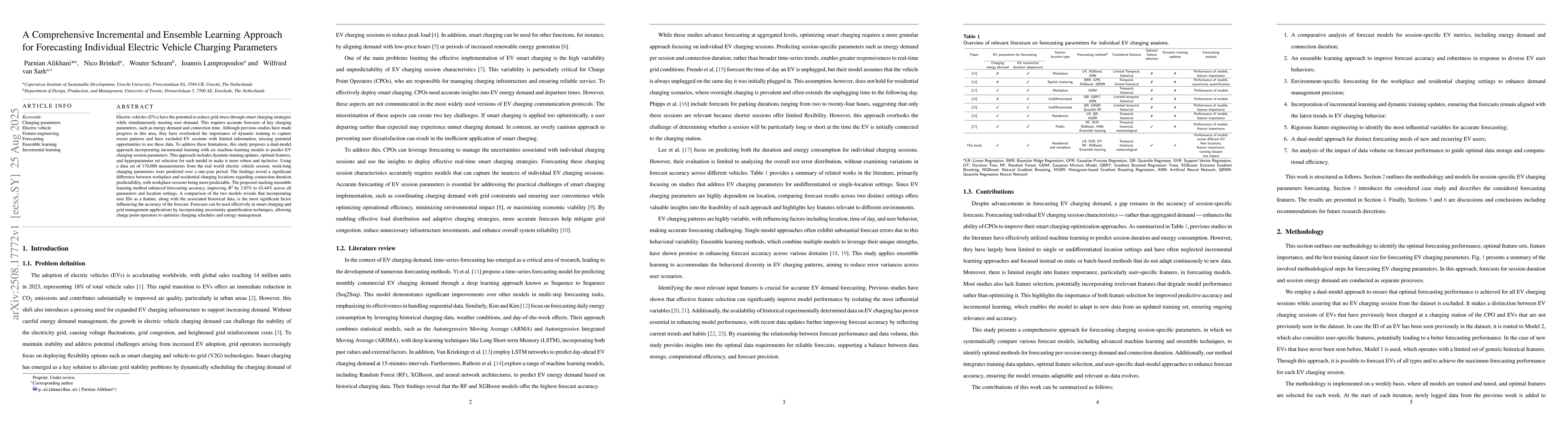 Electric vehicles (EVs) have the potential to reduce grid stress through smart charging strategies while simultaneously meeting user demand. This requires accurate forecasts of key charging parameters, such as energy demand and connection time. Although previous studies have made progress in this area, they have overlooked the importance of dynamic training to capture recent patterns and have excluded EV sessions with limited information, missing potential opportunities to use these data. To address these limitations, this study proposes a dual-model approach incorporating incremental learning with six machine-learning models to predict EV charging session parameters. This approach includes dynamic training updates, optimal features, and hyperparameter set selection for each model to make it more robust and inclusive. Using a data set of 170,000 measurements from the real world electric vehicle session, week-long charging parameters were predicted over a one-year period. The findings reveal a significant difference between workplace and residential charging locations regarding connection duration predictability, with workplace sessions being more predictable. The proposed stacking ensemble learning method enhanced forecasting accuracy, improving R2 by 2.83% to 43.44% across all parameters and location settings. A comparison of the two models reveals that incorporating user IDs as a feature, along with the associated historical data, is the most significant factor influencing the accuracy of the forecast. Forecasts can be used effectively in smart charging and grid management applications by incorporating uncertainty quantification techniques, allowing charge point operators to optimize charging schedules and energy management.