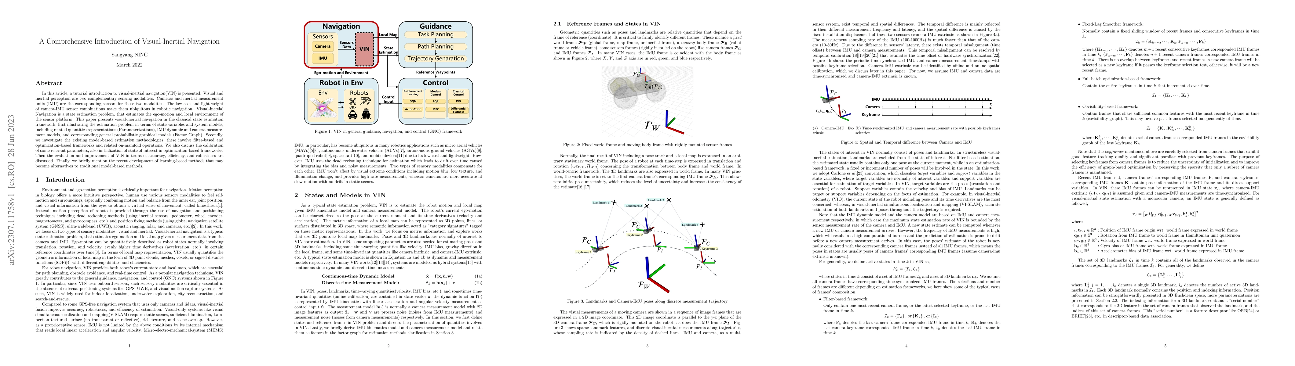 In this article, a tutorial introduction to visual-inertial navigation(VIN) is presented. Visual and inertial perception are two complementary sensing modalities. Cameras and inertial measurement units (IMU) are the corresponding sensors for these two modalities. The low cost and light weight of camera-IMU sensor combinations make them ubiquitous in robotic navigation. Visual-inertial Navigation is a state estimation problem, that estimates the ego-motion and local environment of the sensor platform. This paper presents visual-inertial navigation in the classical state estimation framework, first illustrating the estimation problem in terms of state variables and system models, including related quantities representations (Parameterizations), IMU dynamic and camera measurement models, and corresponding general probabilistic graphical models (Factor Graph). Secondly, we investigate the existing model-based estimation methodologies, these involve filter-based and optimization-based frameworks and related on-manifold operations. We also discuss the calibration of some relevant parameters, also initialization of state of interest in optimization-based frameworks. Then the evaluation and improvement of VIN in terms of accuracy, efficiency, and robustness are discussed. Finally, we briefly mention the recent development of learning-based methods that may become alternatives to traditional model-based methods.