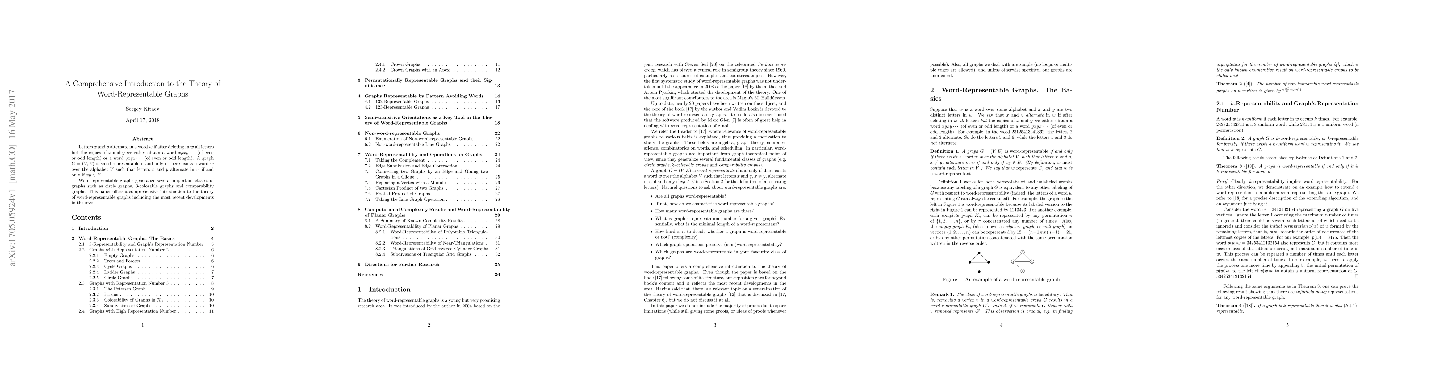 This paper provides an extensive overview of the theory of word-representable graphs, defining them as graphs that can be represented by alternating sequences of letters in a word corresponding to their edges. It discusses their generalizations and recent advancements in the field.