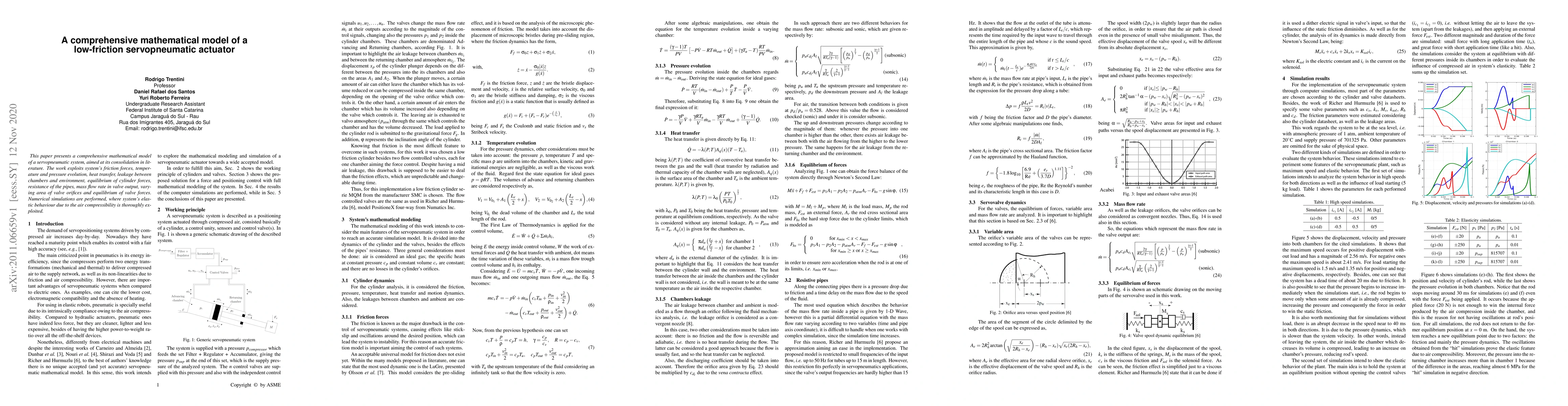 This paper presents a comprehensive mathematical model of a servopneumatic system, aimed at its consolidation in literature. The work exploits system's friction forces, temperature and pressure evolution, heat transfer, leakage between chambers and environment, equilibrium of cylinder forces, resistance of the pipes, mass flow rate in valve output, varying area of valve orifices and equilibrium of valve forces. Numerical simulations are performed, where system's elastic behaviour due to the air compressibility is thoroughly exploited.