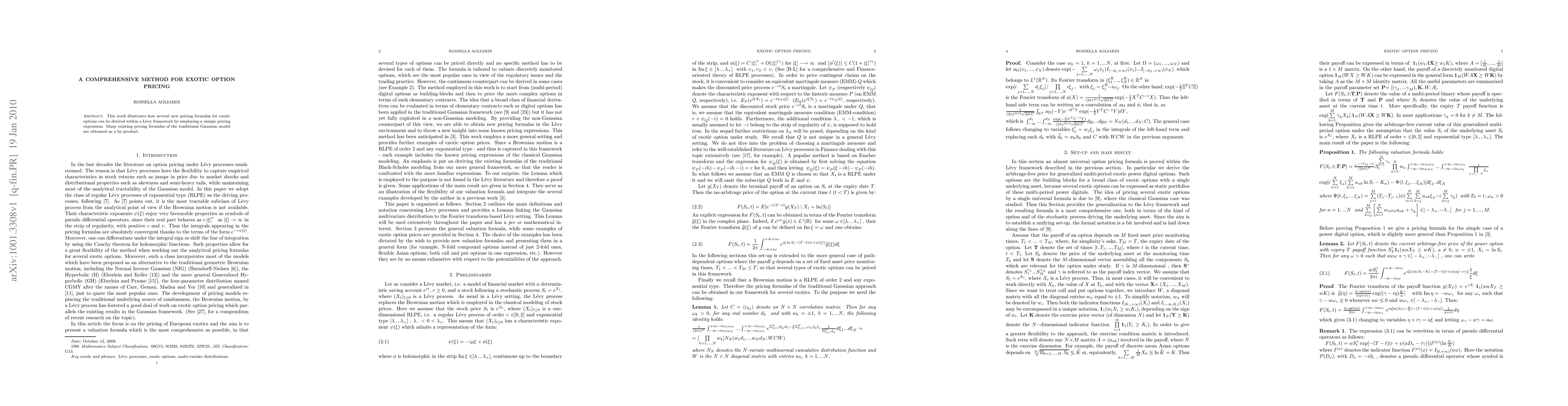 This paper presents a novel method for pricing exotic options using a Levy framework, deriving new formulas and rederiving traditional Gaussian model formulas as a result.
