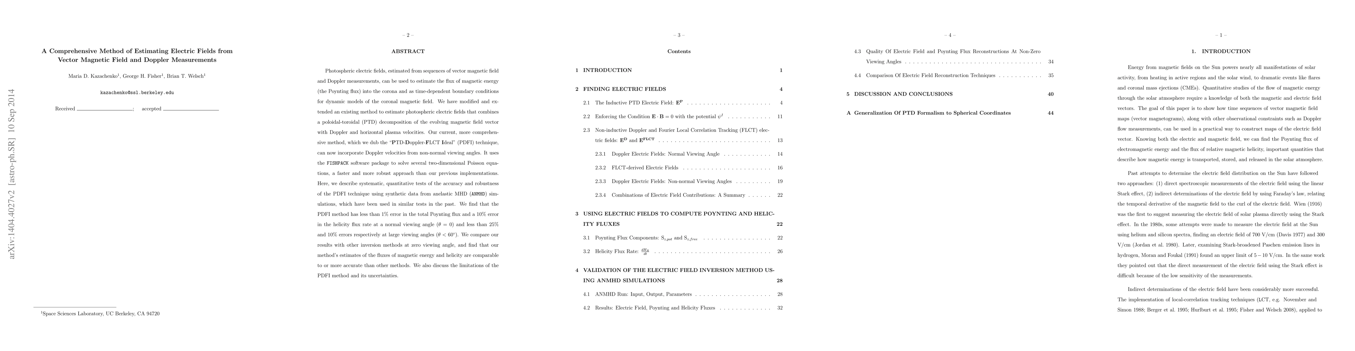 This paper introduces a refined method, the PDFI technique, for estimating photospheric electric fields from vector magnetic field and Doppler measurements. It shows improved accuracy and robustness, achieving less than 1% error in Poynting flux and 10% in helicity flux rate, with comparisons indicating its competitive accuracy over other inversion methods.