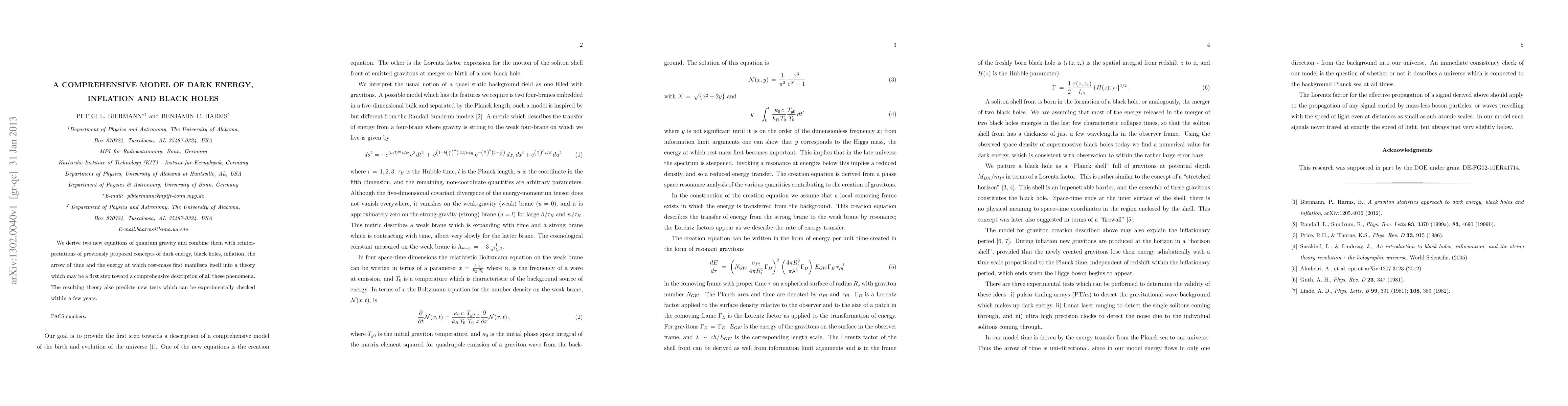 We derive two new equations of quantum gravity and combine them with reinterpretations of previously proposed concepts of dark energy, black holes, inflation, the arrow of time and the energy at which rest-mass first manifests itself into a theory which may be a first step toward a comprehensive description of all these phenomena. The resulting theory also predicts new tests which can be experimentally checked within a few years.