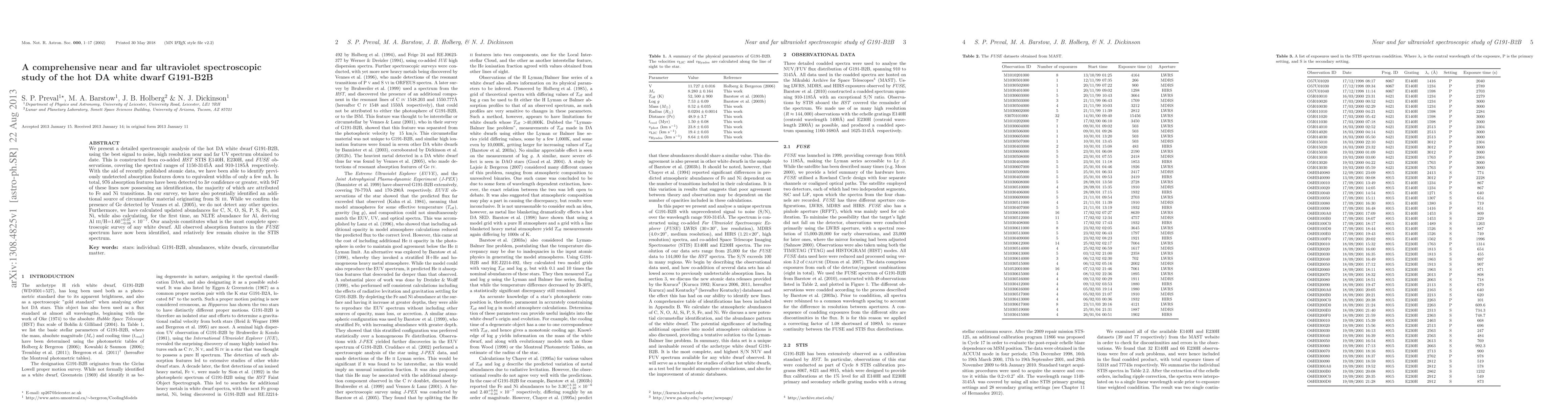 We present a detailed spectroscopic analysis of the hot DA white dwarf G191-B2B, using the best signal to noise, high resolution near and far UV spectrum obtained to date. This is constructed from co-added \textit{HST} STIS E140H, E230H, and \textit{FUSE} observations, covering the spectral ranges of 1150-3145\AA\, and 910-1185\AA\, respectively. With the aid of recently published atomic data, we have been able to identify previously undetected absorption features down to equivalent widths of only a few m\AA. In total, 976 absorption features have been detected to $3\sigma$ confidence or greater, with 947 of these lines now possessing an identification, the majority of which are attributed to Fe and Ni transitions. In our survey, we have also potentially identified an additional source of circumstellar material originating from Si {\sc iii}. While we confirm the presence of Ge detected by \citet{vennes05a}, we do not detect any other species. Furthermore, we have calculated updated abundances for C, N, O, Si, P, S, Fe, and Ni, while also calculating, for the first time, an NLTE abundance for Al, deriving Al {\sc iii}/H=$1.60_{-0.08}^{+0.07}\times{10}^{-7}$. Our analysis constitutes what is the most complete spectroscopic survey of any white dwarf. All observed absorption features in the \textit{FUSE} spectrum have now been identified, and relatively few remain elusive in the STIS spectrum.