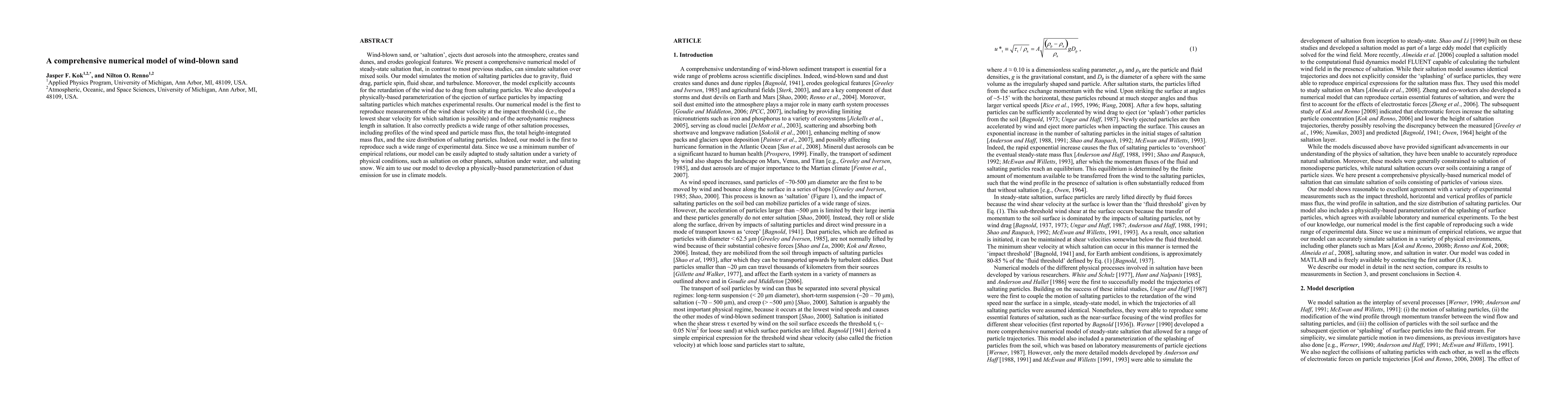 This paper presents a comprehensive numerical model for simulating wind-blown sand (saltation) over mixed soils, accounting for gravity, fluid drag, particle spin, and turbulence. It also reproduces a wide range of experimental data and can be adapted to study saltation under various physical conditions, aiming to develop a dust emission parameterization for climate models.