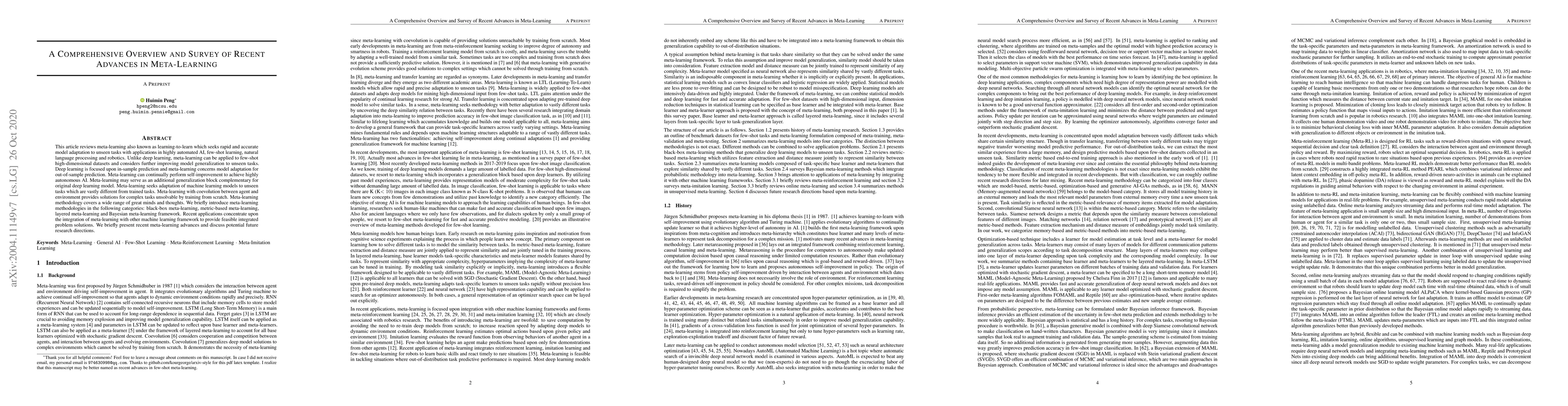 This paper reviews recent advances in meta-learning, a machine learning approach that enables rapid adaptation to new tasks, with potential applications in AI, natural language processing, and robotics. Meta-learning offers a complementary generalization block for original deep learning models, enabling autonomous AI systems to continually improve and adapt.
