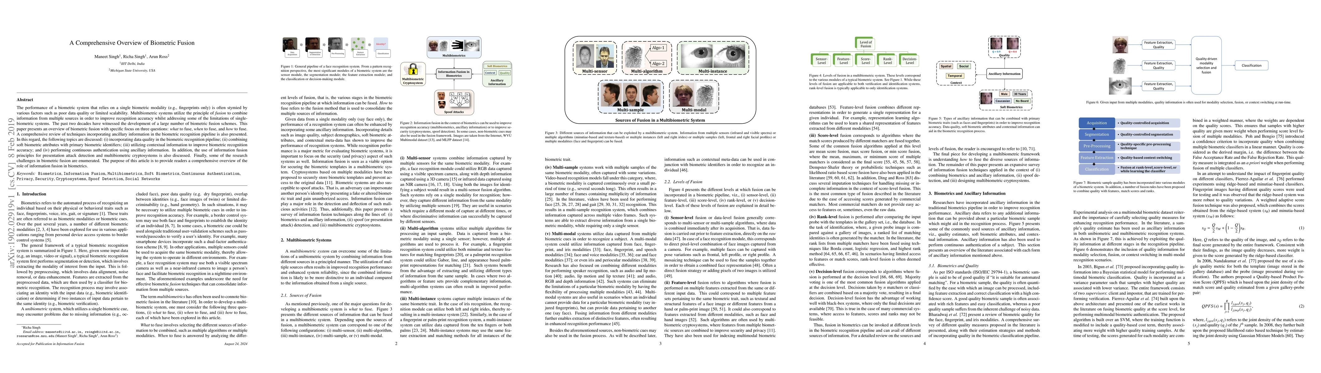 This paper provides a comprehensive overview of biometric fusion techniques, focusing on what, when, and how to combine multiple biometric modalities to enhance recognition accuracy. It discusses integrating data quality, soft biometrics, contextual information, and continuous authentication, along with challenges and applications in presentation attack detection and multibiometric cryptosystems.