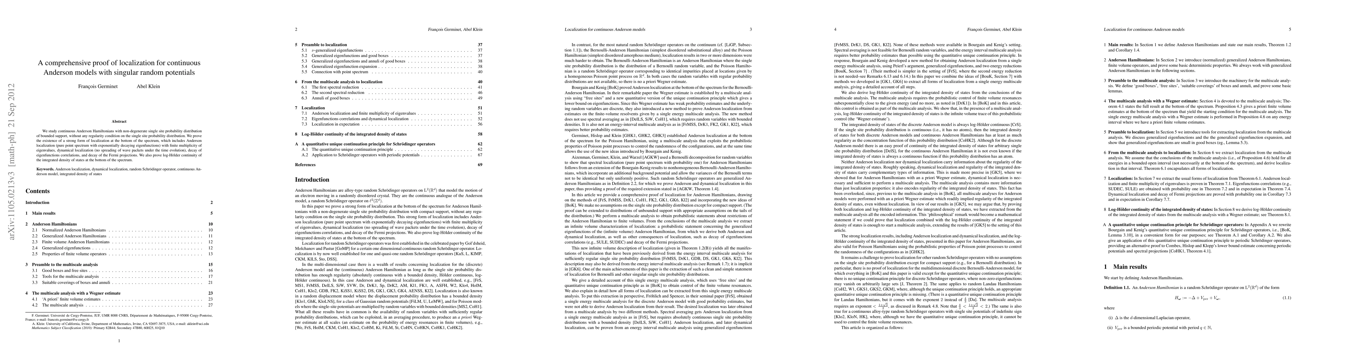This paper proves strong localization for continuous Anderson models with singular random potentials, demonstrating exponential decay of eigenfunctions, dynamical localization, and log-Hölder continuity of the integrated density of states at the spectrum's bottom. The study does not require any regularity conditions on the potential distribution.