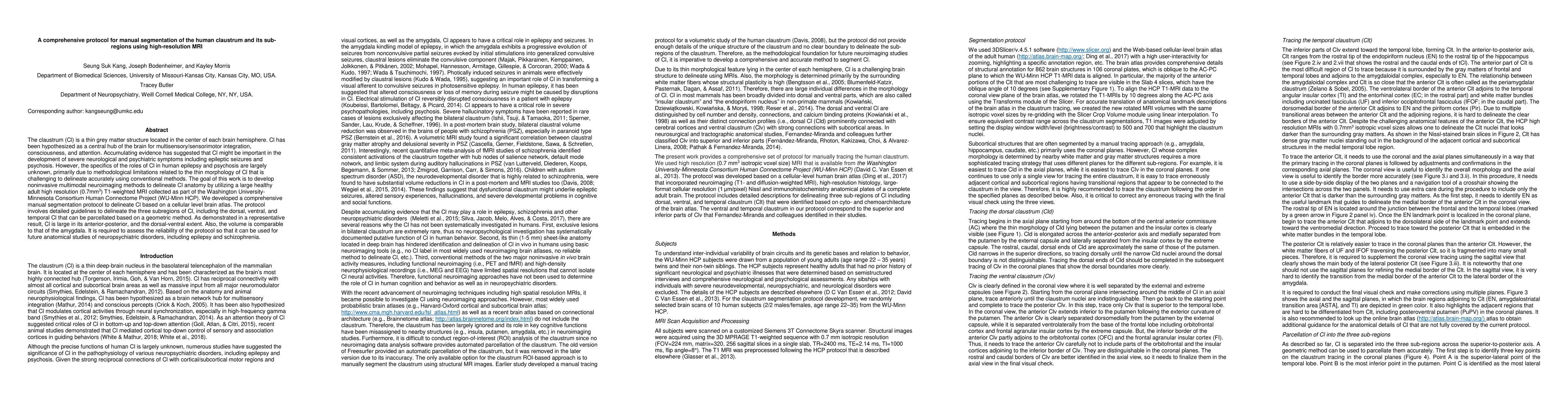 This paper presents a detailed manual segmentation protocol for accurately delineating the human claustrum and its sub-regions using high-resolution MRI. The protocol aims to address methodological limitations in studying the claustrum's role in neurological and psychiatric disorders, offering a reliable method for future research.