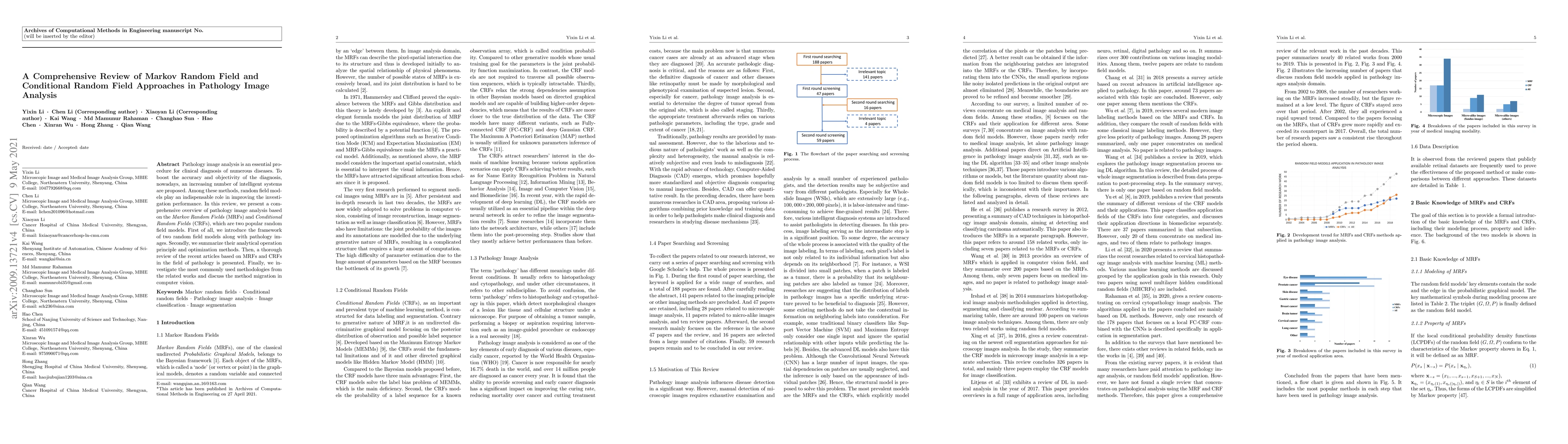 This paper reviews the application of Markov Random Fields (MRFs) and Conditional Random Fields (CRFs) in pathology image analysis for clinical diagnosis. It provides a comprehensive overview of the mathematical foundations and recent research trends in these random field models, highlighting their role in enhancing the accuracy and objectivity of computer-aided diagnosis systems.