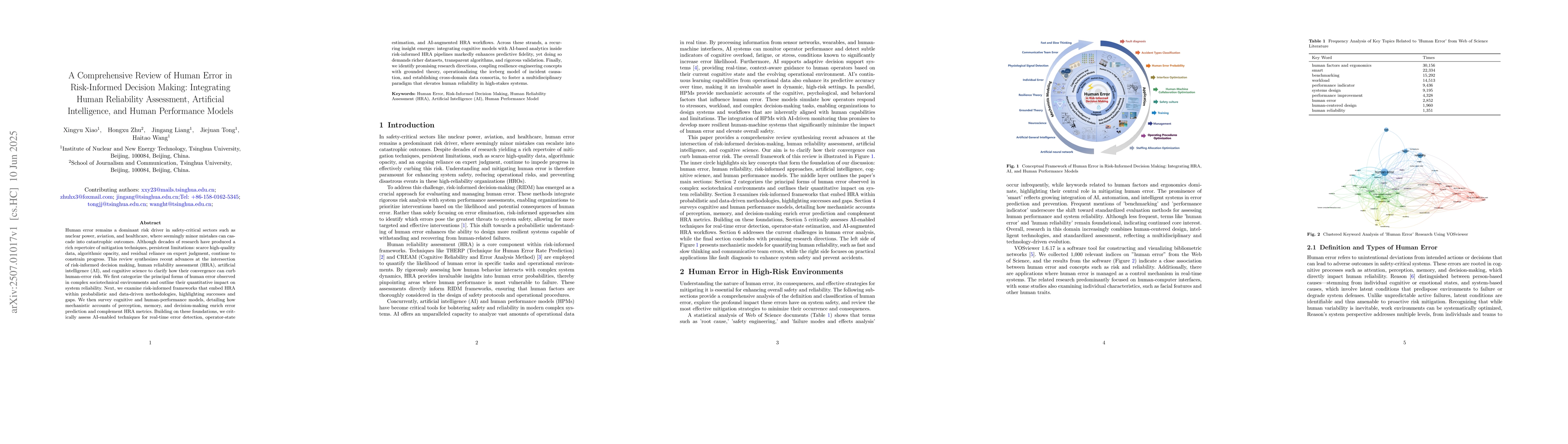 Human error remains a dominant risk driver in safety-critical sectors such as nuclear power, aviation, and healthcare, where seemingly minor mistakes can cascade into catastrophic outcomes. Although decades of research have produced a rich repertoire of mitigation techniques, persistent limitations: scarce high-quality data, algorithmic opacity, and residual reliance on expert judgment, continue to constrain progress. This review synthesizes recent advances at the intersection of risk-informed decision making, human reliability assessment (HRA), artificial intelligence (AI), and cognitive science to clarify how their convergence can curb human-error risk. We first categorize the principal forms of human error observed in complex sociotechnical environments and outline their quantitative impact on system reliability. Next, we examine risk-informed frameworks that embed HRA within probabilistic and data-driven methodologies, highlighting successes and gaps. We then survey cognitive and human-performance models, detailing how mechanistic accounts of perception, memory, and decision-making enrich error prediction and complement HRA metrics. Building on these foundations, we critically assess AI-enabled techniques for real-time error detection, operator-state estimation, and AI-augmented HRA workflows. Across these strands, a recurring insight emerges: integrating cognitive models with AI-based analytics inside risk-informed HRA pipelines markedly enhances predictive fidelity, yet doing so demands richer datasets, transparent algorithms, and rigorous validation. Finally, we identify promising research directions, coupling resilience engineering concepts with grounded theory, operationalizing the iceberg model of incident causation, and establishing cross-domain data consortia, to foster a multidisciplinary paradigm that elevates human reliability in high-stakes systems.