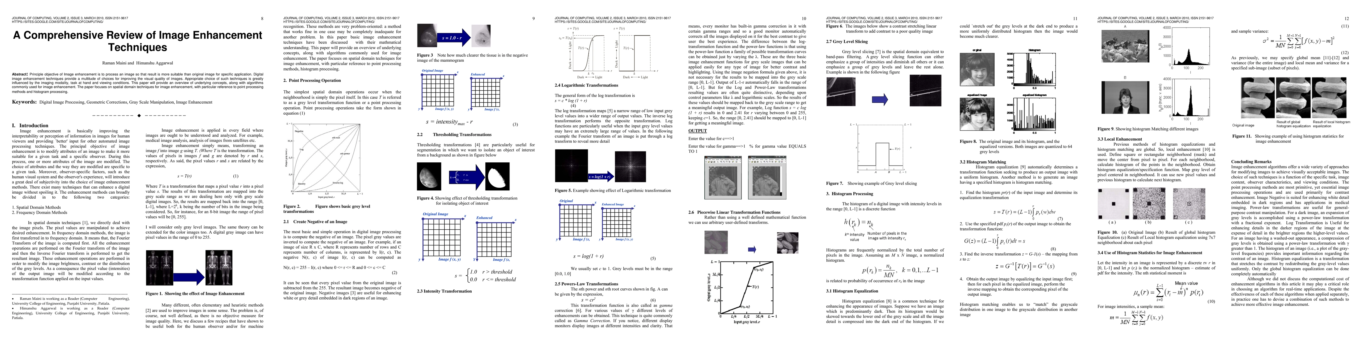 This paper reviews various digital image enhancement techniques aimed at improving visual quality for specific applications, focusing on spatial domain methods like point processing and histogram processing. It highlights the influence of imaging modality, task requirements, and viewing conditions on technique selection.