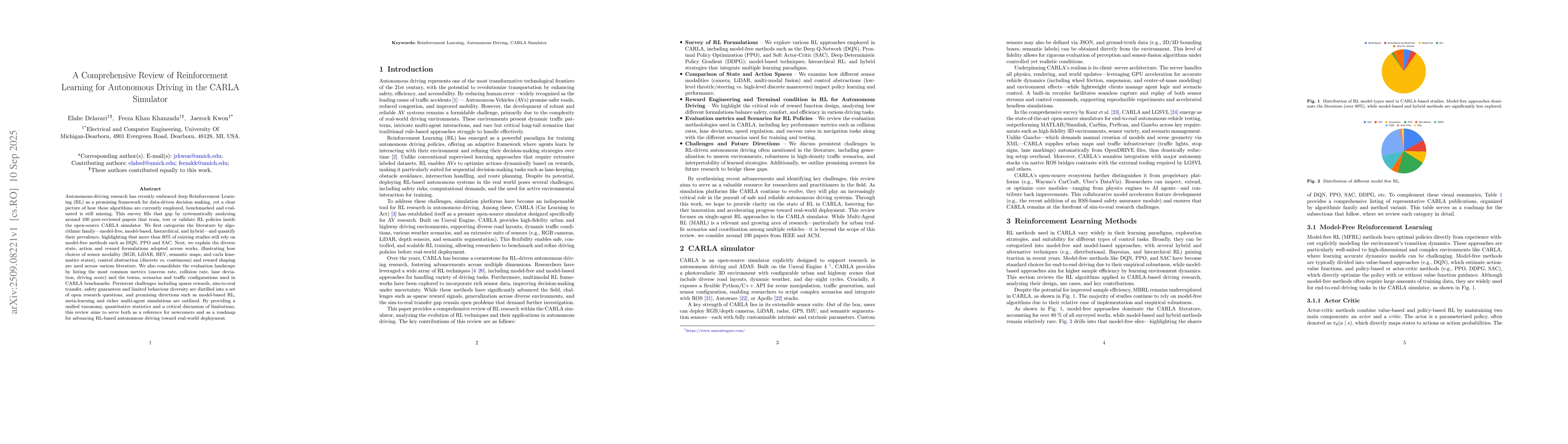 Autonomous-driving research has recently embraced deep Reinforcement Learning (RL) as a promising framework for data-driven decision making, yet a clear picture of how these algorithms are currently employed, benchmarked and evaluated is still missing. This survey fills that gap by systematically analysing around 100 peer-reviewed papers that train, test or validate RL policies inside the open-source CARLA simulator. We first categorize the literature by algorithmic family model-free, model-based, hierarchical, and hybrid and quantify their prevalence, highlighting that more than 80% of existing studies still rely on model-free methods such as DQN, PPO and SAC. Next, we explain the diverse state, action and reward formulations adopted across works, illustrating how choices of sensor modality (RGB, LiDAR, BEV, semantic maps, and carla kinematics states), control abstraction (discrete vs. continuous) and reward shaping are used across various literature. We also consolidate the evaluation landscape by listing the most common metrics (success rate, collision rate, lane deviation, driving score) and the towns, scenarios and traffic configurations used in CARLA benchmarks. Persistent challenges including sparse rewards, sim-to-real transfer, safety guarantees and limited behaviour diversity are distilled into a set of open research questions, and promising directions such as model-based RL, meta-learning and richer multi-agent simulations are outlined. By providing a unified taxonomy, quantitative statistics and a critical discussion of limitations, this review aims to serve both as a reference for newcomers and as a roadmap for advancing RL-based autonomous driving toward real-world deployment.